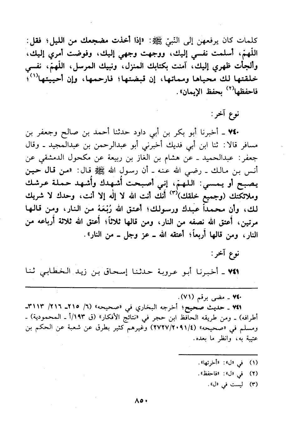 740 - أخبرنا أبو بكر بن أبي داود حدثنا أحمد بن صالح وجعفر بن مسافر قالا: ثنا ابن أبي فديك أخبرني أبو عبد الرحمن بن عبد المجيد -وقال جعفر: عبد الحميد- عن هشام بن الغاز بن ربيعة عن مكحول الدمشقي عن أنس بن مالك - رضي الله عنه - أن رسول الله - صلى الله عليه وسلم - قال: "من قال حين يصبح أو يمسي: اللهمّ، إني أصبحت أُشهدك وأُشهد حملة عرشك وملائكتك (وجميع خلقك) (¬3) أَنك أنت الله لا إله إلا أنت، وحدك لا شريك لك، وأن محمدًا عبدك ورسولك؛ أعتق الله رُبْعَهُ من النار، ومن قالها مرتين، أَعتق الله نصفه من النار، ومن قالها ثلالًا؛ أَعتق الله ثلاثة أَرباعه من النار، ومن قالها أَربعًا؛ أعتقه الله - عَزَّ وَجَلَّ - من النار".
