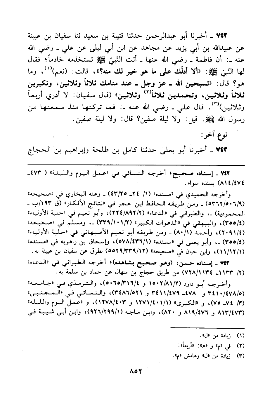 742 - أخبرنا أبو عبد الرحمن حدثنا قتيبة بن سعيد ثنا سفيان بن عيينة عن عبيد الله بن أبي يزيد عن مجاهد عن ابن أبي ليلى عن علي - رضي الله عنه -: أن فاطمة - رضي الله عنها - أتت النّبىّ - صلى الله عليه وسلم - تستخدمه خادمًا؛ فقال لها النّبيّ - صلى الله عليه وسلم -"ألا أدلّك على ما هو خير لك منه؟ "، قالت: (نعم) (¬1)، وما هو؟ قال: "تسبحين الله - عَزَّ وَجَلَّ - عند منامك ثلاثًا وثلاثين، وتكبرين ثلاثًا وثلاثين، وتحمدين ثلاثًا (¬2) وثلاثين" (قال سفيان: لا أدري أربعًا وثلاثين) (¬3). قال علي - رضي الله عنه -: فما تركتها منذ سمعتها من رسول الله - صلى الله عليه وسلم -. قيل: ولا ليلة صفين؟ قال: ولا ليلة صفين.