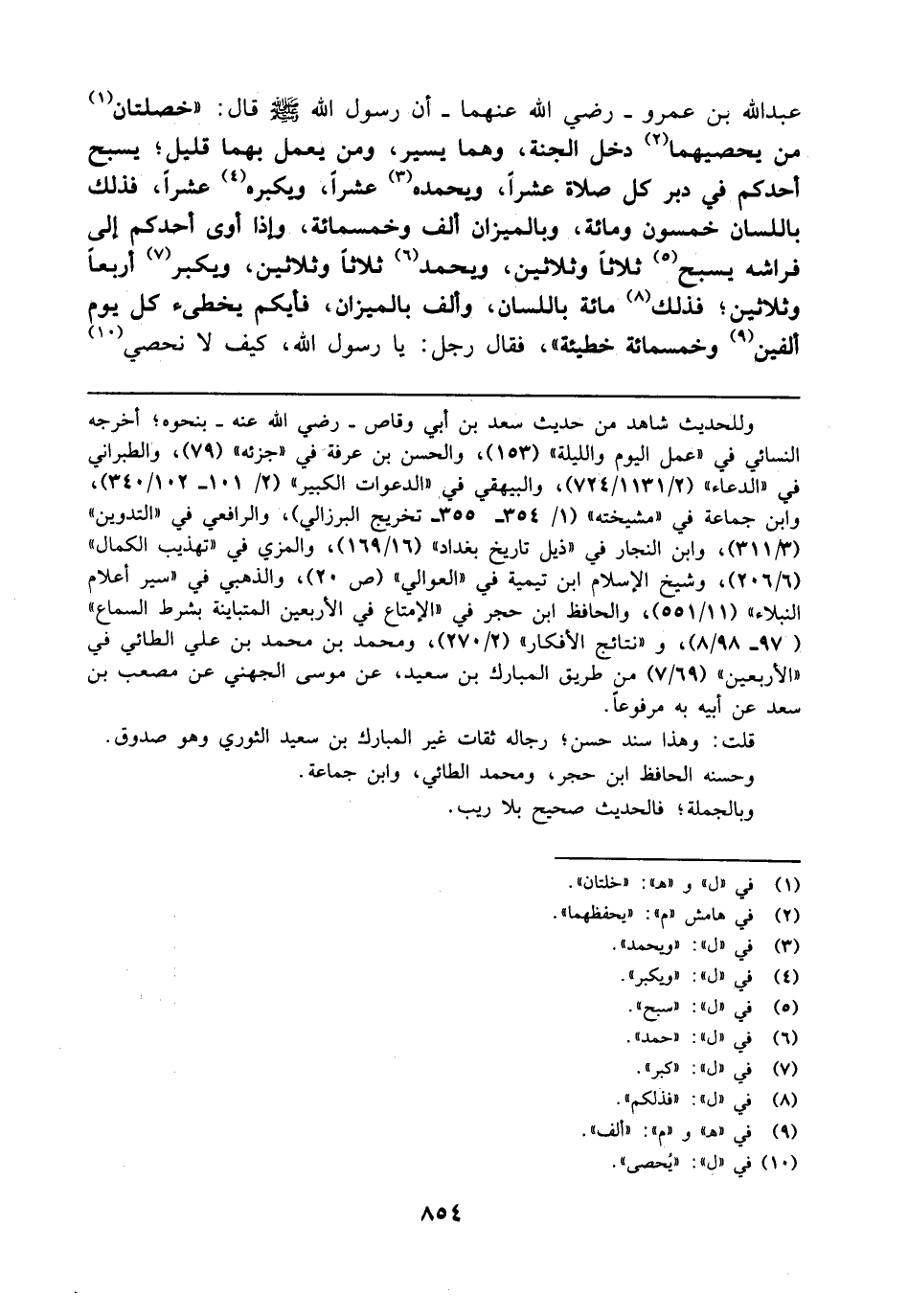 عبد الله بن عمرو - رضي الله عنهما - أن رسول الله - صلى الله عليه وسلم - قال: "خصلتان (¬1) من يحصيهما (¬2) دخل الجنة، وهما يسير، ومن يعمل بهما قليل؛ يسبح أحدكم في دبر كل صلاة عشرًا، ويحمده (¬3) عشرًا، ويكبره (¬4) عشرًا، فذلك باللسان خمسون ومائة، وبالميزان ألف وخمسمائة، وإذا أوى أحدكم إلى فراشه يسبح (¬5) ثلاثًا وثلاثين، ويحمد (¬6) ثلاثًا وثلاثين، ويكبر (¬7) أربعًا وثلاثين؛ فذلك (¬8) مائة باللسان، وألف بالميزان، فأيكم يخطئ كل يوم ألفين (¬9) وخمسمائة خطيئة"، فقال رجل: يا رسول الله، كيف لا نحصي (¬10)