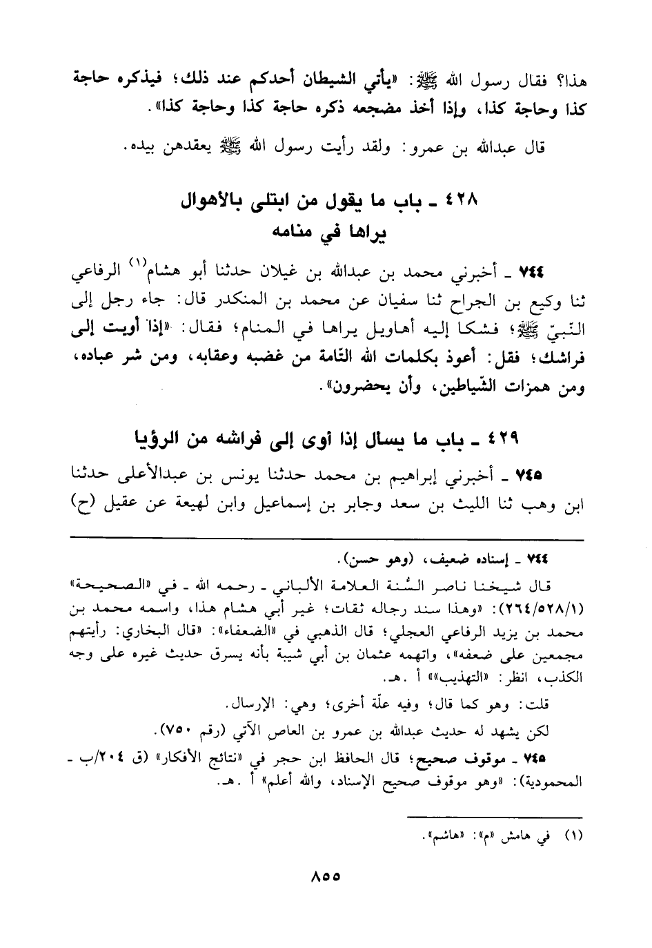 428 - باب ما يقول من ابتلى بالأهوال يراها في منامه