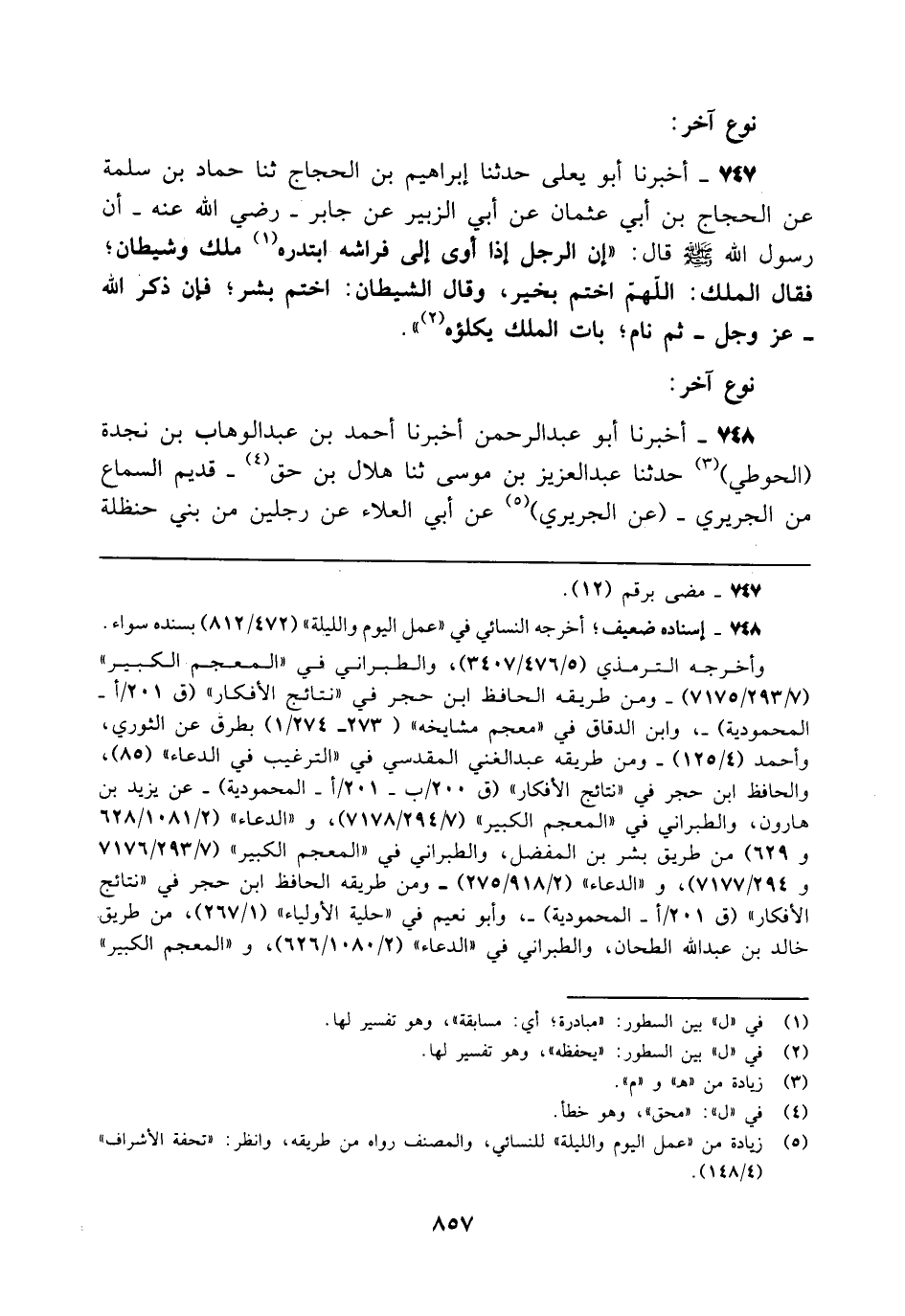 747 - أخبرنا أبو يعلى حدثنا إبراهيم بن الحجاج ثنا حماد بن سلمة عن الحجاج بن أبي عثمان عن أبي الزبير عن جابر - رضي الله عنه - أن رسول الله - صلى الله عليه وسلم - قال: "إن الرجل إذا أوى إلى فراشه ابتدره (¬1) ملك وشيطان؛ فقال الملك: اللهمّ اختم بخير، وقال الشيطان: اختم بشر؛ فإن ذكر الله - عَزَّ وَجَلَّ - ثم نام؛ بات الملك يكلؤه (¬2) ".