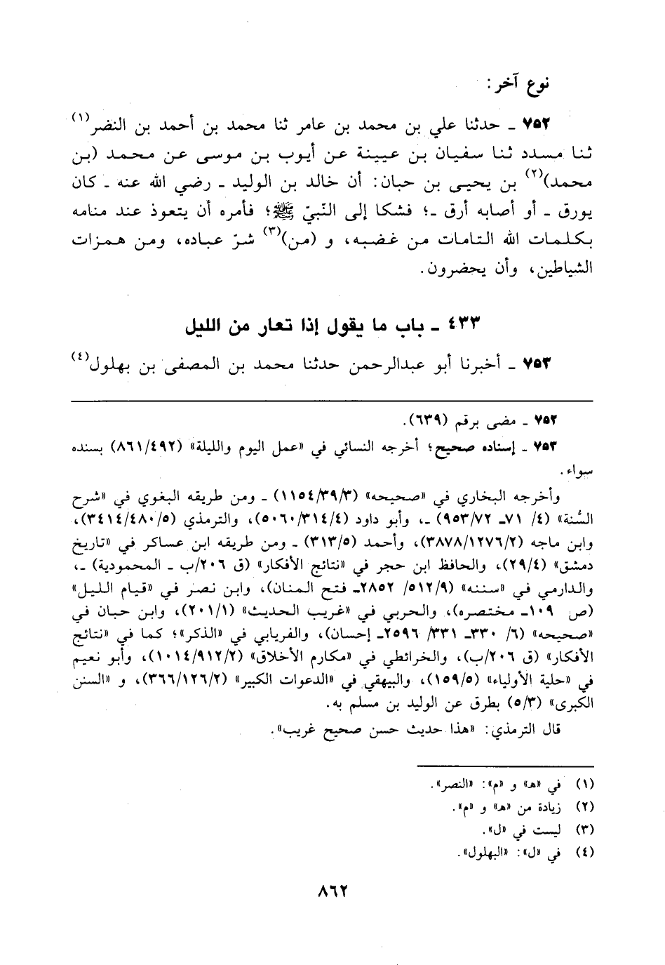 752 - حدثنا علي بن محمَّد بن عامر ثنا محمَّد بن أحمد بن النضر (¬1) ثنا مسدد ثنا سفيان بن عيينة عن أيوب بن موسى عن محمَّد (بن محمَّد) (¬2) بن يحيى بن حبان: أن خالد بن الوليد - رضي الله عنه - كان يورق -أو أصابه أرق-؛ فشكا إلى النّبيّ - صلى الله عليه وسلم -؛ فأمره أن يتعوذ عند منامه بكلمات الله التامات من غضبه، و (من) (¬3) شرّ عباده، ومن همزات الشياطين، وأن يحضرون.