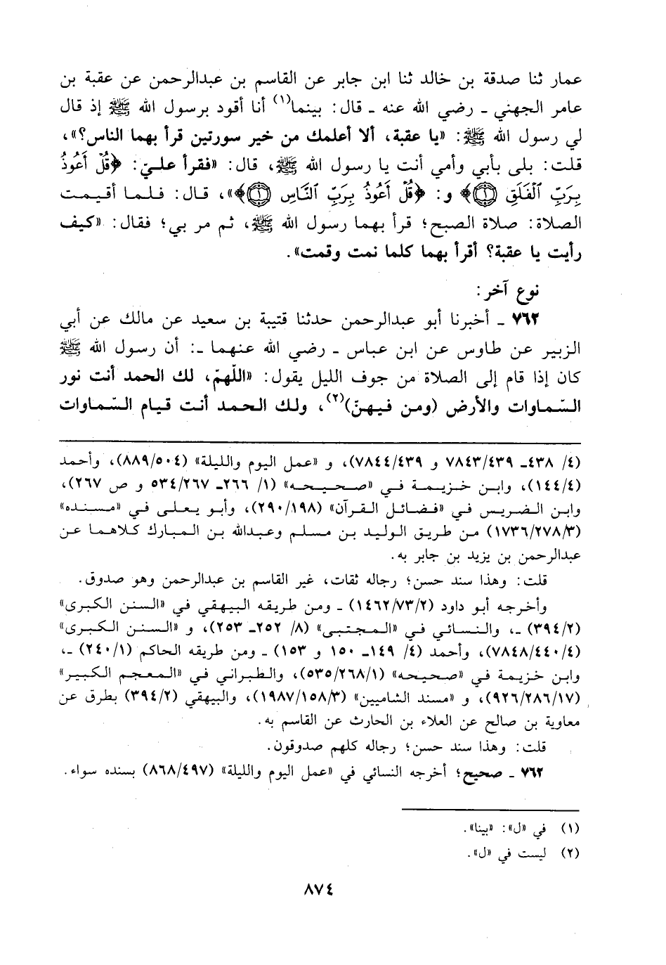 عمار ثنا صدقة بن خالد ثنا ابن جابر عن القاسم بن عبد الرحمن عن عقبة بن عامر الجهني - رضي الله عنه - قال: بينما (¬1) أنا أقود برسول الله - صلى الله عليه وسلم - إذ قال لي رسول الله - صلى الله عليه وسلم -: "يا عقبة، ألا أعلمك من خير سورتين قرأ بهما الناس؟ "، قلت: بلى بأبي وأمي أنت يا رسول الله - صلى الله عليه وسلم -، قال: "فقرأ عليّ: {قُلْ أَعُوذُ بِرَبِّ الْفَلَقِ (1)} و: {قُلْ أَعُوذُ بِرَبِّ النَّاسِ (1)} "، قال: فلما أقيمت الصلاة: صلاة الصبح؛ قرأ بهما رسول الله - صلى الله عليه وسلم -، ثم مر بي؛ فقال: "كيف رأيت يا عقبة؟ أقرأ بهما كلما نمت وقمت".