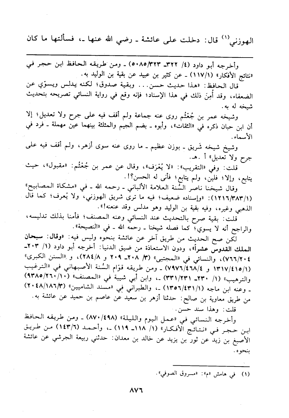 وأخرجه النسائي في "عمل اليوم والليلة" (498/ 870) -ومن طريقه الحافظ ابن حجر في "نتائج الأفكار" (1/ 118 - 119) -، وأحمد (6/ 143) من طريق الأصبغ بن زيد عن ثور بن يزيد عن خالد بن معدان: حدثني ربيعة الجرشي عن عائشة بنحوه.