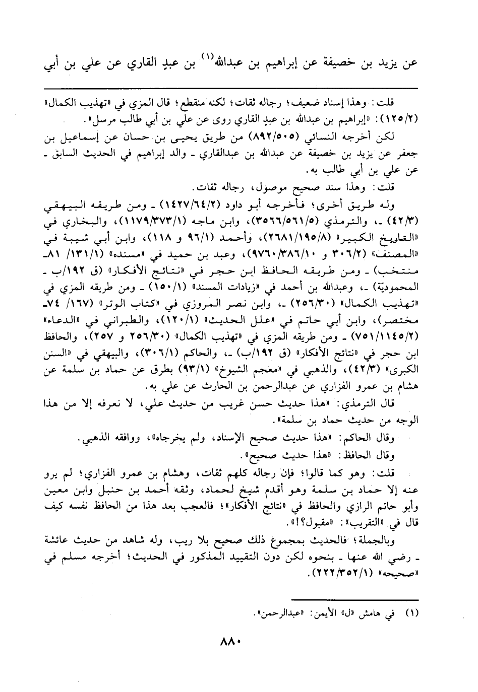 وله طريق أخرى، فأخرجه أبو داود (2/ 64/ 1427) -ومن طريقه البيهقي (3/ 42) -، والترمذي (5/ 561/ 3566)، وابن ماجه (1/ 373/ 1179)، والبخاري في "التاريخ الكبير" (8/ 195/ 2681)، وأحمد (1/ 96 و 118)، وابن أبي شيبة في "المصنف" (2/ 306 و 10/ 386/ 9760)، وعبد بن حميد في "مسنده" (1/ 131/ 81 - منتخب) -ومن طريقه الحافظ ابن حجر في "نتائج الأفكار" (ق 192 /ب - المحموديّة) -، وعبد الله بن أحمد في "زيادات المسند" (1/ 150) -ومن طريقه المزي في "تهذيب الكمال" (30/ 256) -، وابن نصر المروزي في "كتاب الوتر" (167/ 74 - مختصر)، وابن أبي حاتم في "علل الحديث" (1/ 120)، والطبراني في "الدعاء" (2/ 1145/ 751) -ومن طريقه المزي في "تهذيب الكمال" (30/ 256 و 257)، والحافظ ابن حجر في "نتائج الأفكار" (ق 192 /ب) -، والحاكم (1/ 306)، والبيهقي في "السنن الكبرى" (3/ 42)، والذهبي في "معجم الشيوخ" (1/ 93) بطرق عن حماد بن سلمة عن هشام بن عمرو الفزاري عن عبد الرحمن بن الحارث عن علي به.