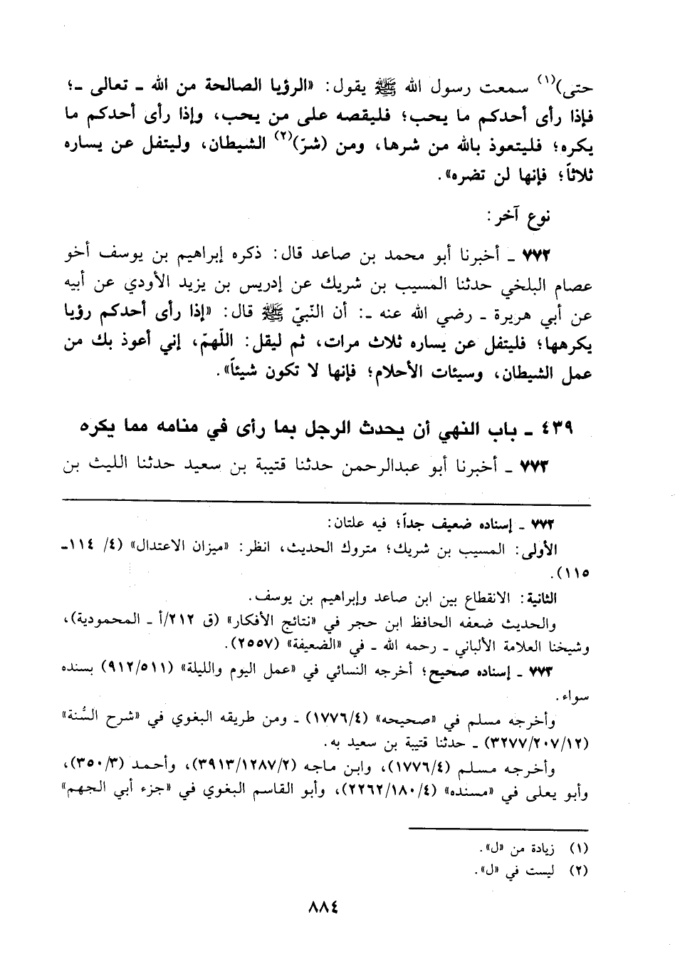 772 - أخبرنا أبو محمَّد بن صاعد قال: ذكره إبراهيم بن يوسف أخو عصام البلخي حدثنا المسيب بن شريك عن إدريس بن يزيد الأودي عن أبيه عن أبي هريرة - رضي الله عنه -: أن النّبيّ - صلى الله عليه وسلم - قال: "إذا رأى أحدكم رؤيا يكرهها؛ فليتفل عن يساره ثلاث مرات، ثم ليقل: اللهمّ، إني أعوذ بك من عمل الشيطان، وسيئات الأحلام؛ فإنها لا تكون شيئًا".