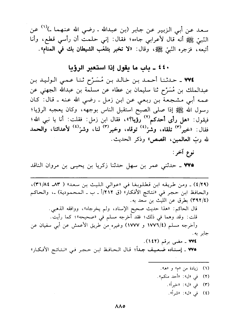 سعد عن أبي الزبير عن جابر (بن عبد الله - رضي الله عنهما -) (¬1) عن النّبيّ - صلى الله عليه وسلم - أنه قال لأعرابي جاءه؛ فقال: إني حلمت أن رأسي قطع، وأنا أتبعه، فزجره النّبيّ - صلى الله عليه وسلم -، وقال: "لا تخبر بتلعّب الشيطان بك في المنام".
