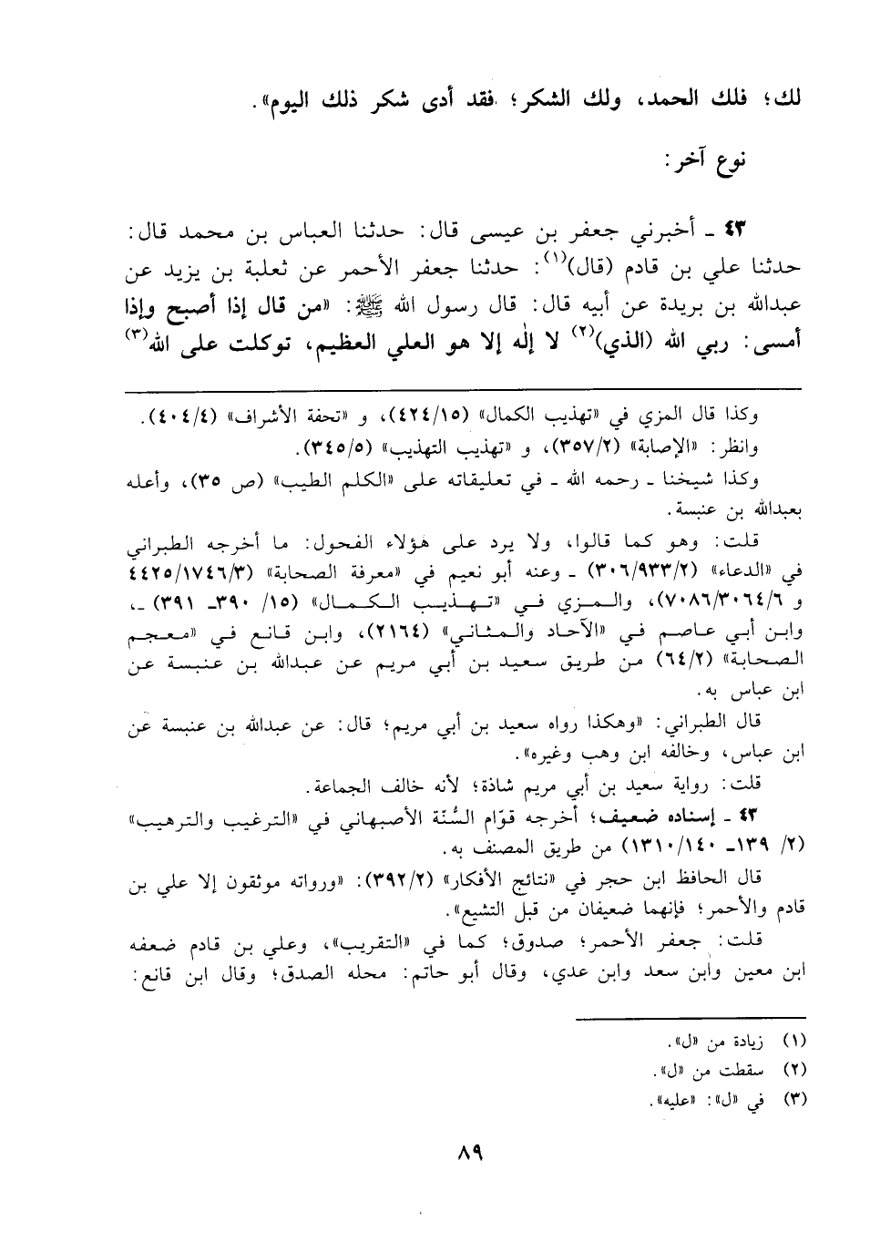 43 - أخبرني جعفر بن عيسى قال: حدثنا العباس بن محمد قال: حدثنا علي بن قادم (قال) (¬1): حدثنا جعفر الأحمر عن ثعلبة بن يزيد عن عبد الله بن بريدة عن أبيه قال: قال رسول الله - صلى الله عليه وسلم -: "من قال إذا أصبح وإذا أمسى: ربي الله (الذي) (¬2) لا إله إلا هو العلي العظيم، توكلت على الله (¬3)