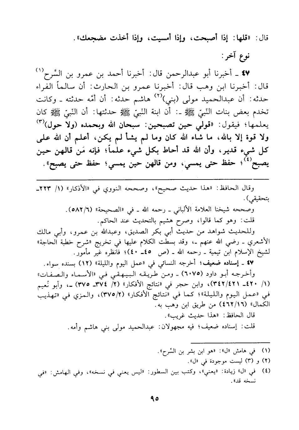 47 - أخبرنا أبو عبد الرحمن قال: أخبرنا أحمد بن عمرو بن السَّرح (¬1) قال: أخبرنا ابن وهب قال: أخبرنا عمرو بن الحارث: أن سالمًا الفراء حدثه: أن عبد الحميد مولى (بني) (¬2) هاشم حدثه: أن أمَّه حدثته - وكانت تخدم بعض بنات النّبيّ - صلى الله عليه وسلم -: أن ابنة النّبيّ - صلى الله عليه وسلم - حدثتها: أن النّبيّ - صلى الله عليه وسلم - كان يعلمها؛ فيقول: "قولي حين تصبحين: سبحان الله وبحمده (ولا حول) (¬3) ولا قوة إلا بالله، ما شاء الله كان وما لم يشأ لم يكن، أعلم أن الله على كل شيء قدير، وأن الله قد أحاط بكل شيء علمًا؛ فإنه مَن قالهن حين يصبح (¬4)؛ حفظ حتى يمسي، ومن قالهن حين يمسي، حفظ حتى يصبح".