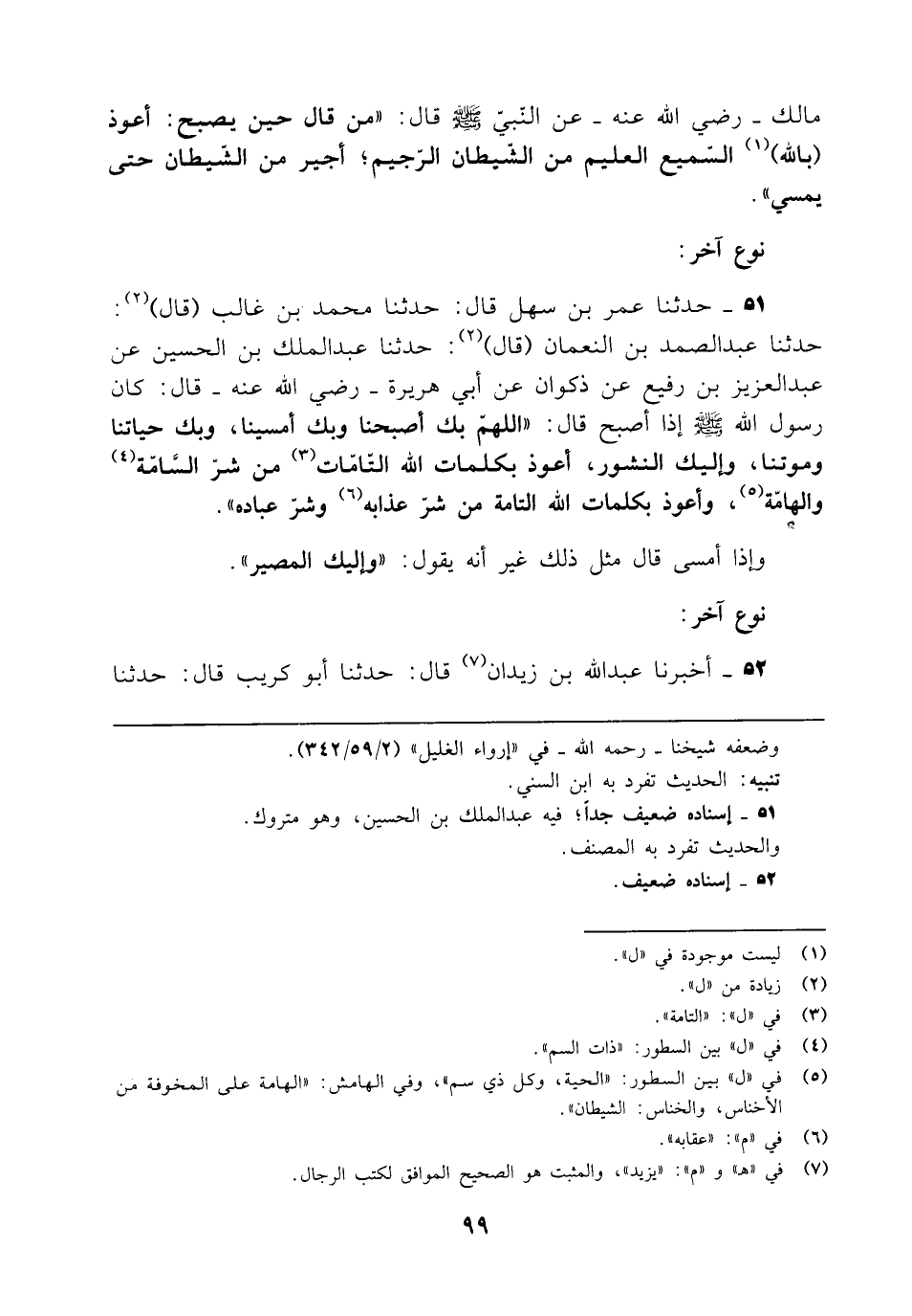 51 - حدثنا عمر بن سهل قال: حدثنا محمد بن غالب (قال) (¬2): حدثنا عبد الصمد بن النعمان (قال) (2): حدثنا عبد الملك بن الحسين عن عبد العزيز بن رفيع عن ذكوان عن أبي هريرة - رضي الله عنه - قال: كان رسول الله - صلى الله عليه وسلم - إذا أصبح قال: "اللهمّ بك أصبحنا وبك أمسينا، وبك حياتنا وموتنا، وإليك النشور، أعوذ بكلمات الله التّامّات (¬3) من شرّ السَّامّة (¬4) والهامّة (¬5)، وأعوذ بكلمات الله التامة من شرّ عذابه (¬6) وشرّ عباده".