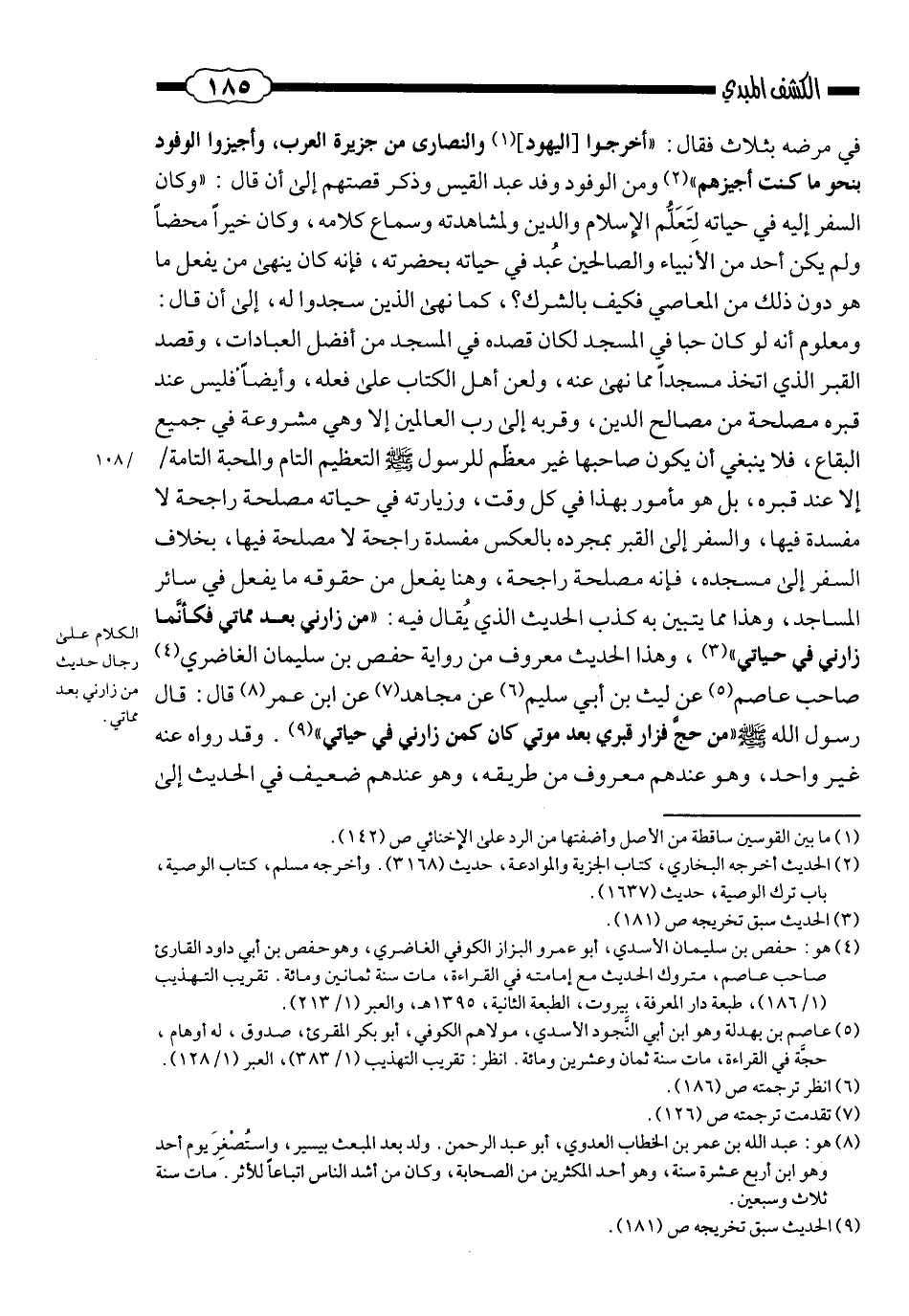 وزيارته في حياته مصلحة راجحة لا مفسدة فيها، والسّفر إلى القبر بمجرّده بالعكس: مفسدة راجحة لا مصلحة فيها، بخلاف السّفر إلى مسجده؛ فإنّه مصلحة راجحة، وهنا يفعل من حقوقه ما يفعل في سائر المساجد، وهذا ممّا يتبيّن به كذب الحديث الذي يٌقال فيه: «مَن زارني بعد مماتي؛ فكأنّما زارني في حياتي» ، وهذا الحديث معروف من رواية حفص بن سليمان الغاضريّ ـ صاحب عاصم ـ، عن ليث بن أبي سليم، عن مجاهد، عن ابن عمر قال: قال رسول الله صلى الله عليه وسلم: «مَن حجّ فزار قبري بعد موتي؛ كان كمَن زارني في حياتي» ، وقد رواه عنه غير واحد، وهو عندهم معروف من طريقه، وهو عندهم ضعيف في الحديث إلى