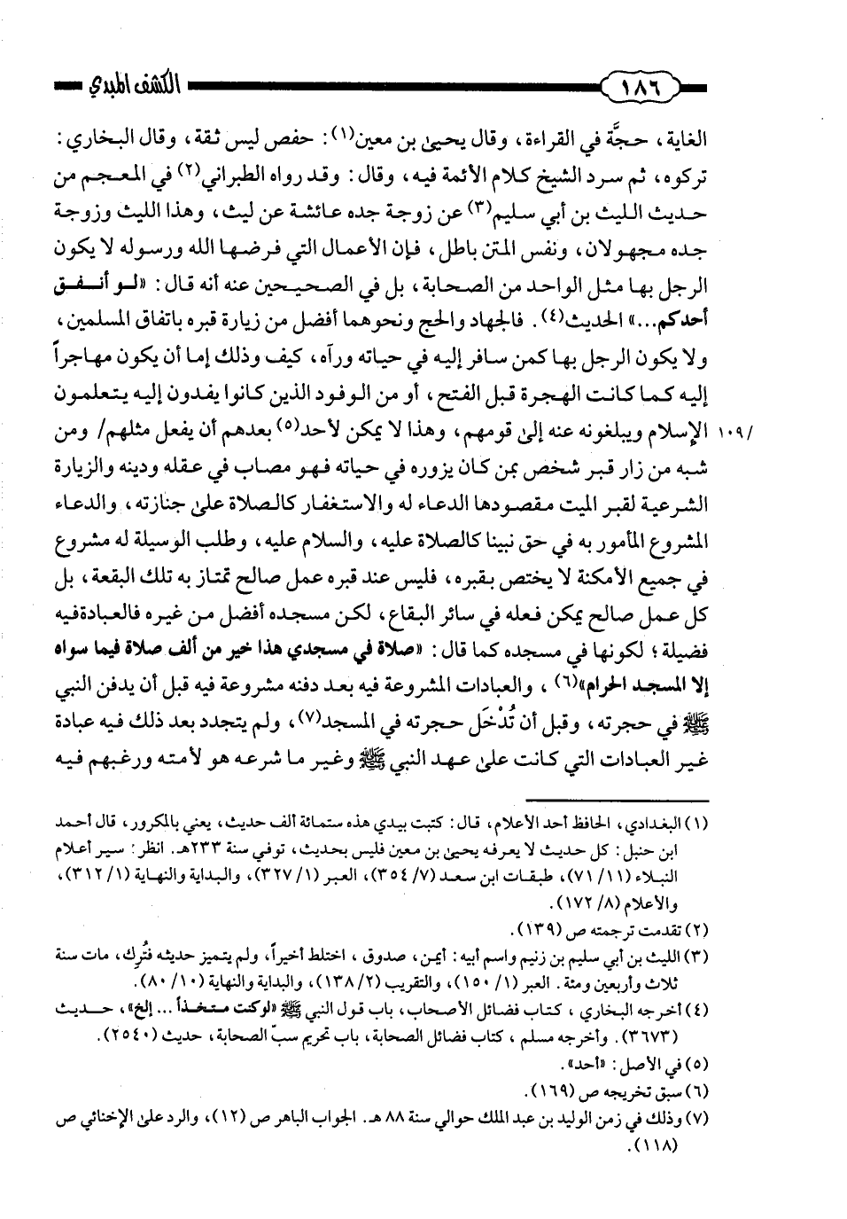 الغاية، حُجّة في القراءة، وقال يحيى بن معين: حفص ليس بثقة، وقال البخاريّ: تركوه ... » ، ثم سرد الشّيخ كلام الأئمّة فيه، وقال: «وقد رواه الطّبرانيّ في «المعجم» من حديث اللّيث بن أبي سليم عن زوجة جدّه عائشة عن ليث، وهذا اللّيث وزوجة جدّه مجهولان، ونفس المتن باطل؛ فإنّ الأعمال التي فرضها الله ورسوله لا يكون الرّجل بها مثل الواحد من الصّحابة؛ بل في «الصّحيحين» عنه أنّه قال: «لو أنفق أحدكم ... » الحديث؛ فالجهاد والحجّ ونحوهما أفضل من زيارة قبره باتّفاق المسلمين، ولا يكون الرجل بهما كمَن سافر إليه في حياته ورآه؛ كيف وذلك إمّا أن يكون مهاجرًا إليه كما كانت الهجرة قبل الفتح، أو من الوفود الذين كانوا يفدون إليه يتعلّمون الإسلام ويبلغونه عنهم إلى قومهم، وهذا لا يمكن لأحد بعدهم أن يفعل مثلهم.