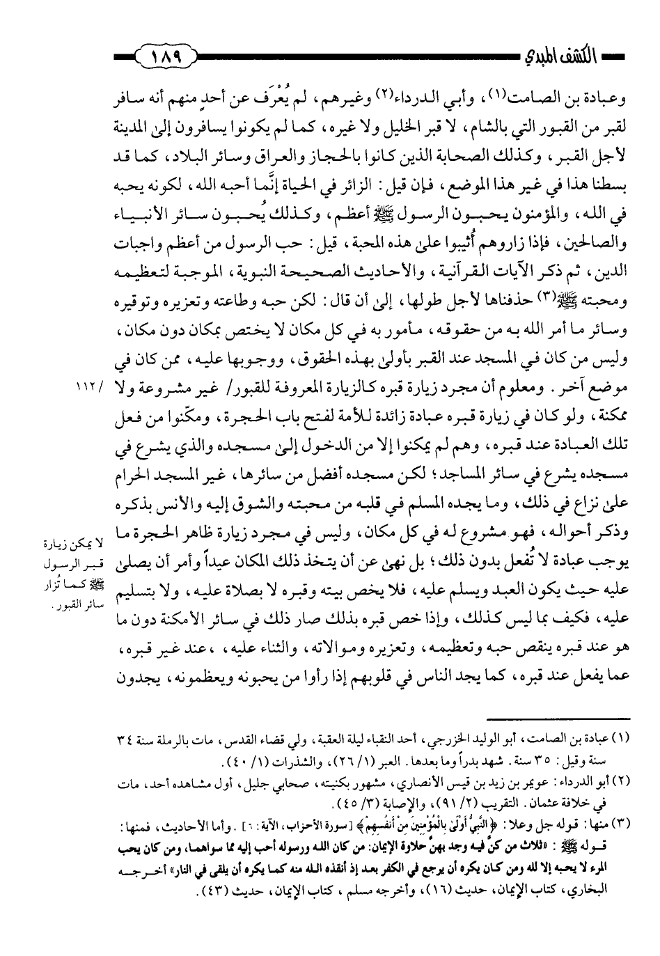 وعبادة بن الصّامت، وأبي الدّرداء، وغيرهم ـ؛ لم يُعرف عن أحد منهم أنّه سافر لقبر من القبور التي بالشّام، لا قبر الخليل ولا غيره، كما لم يكونوا يسافرون إلى المدينة لأجل القبر، وكذلك الصّحابة الذين كانوا بالحجاز والعراق وسائر البلاد ـ كما قد بسطنا هذا في غير هذا الموضع ـ.