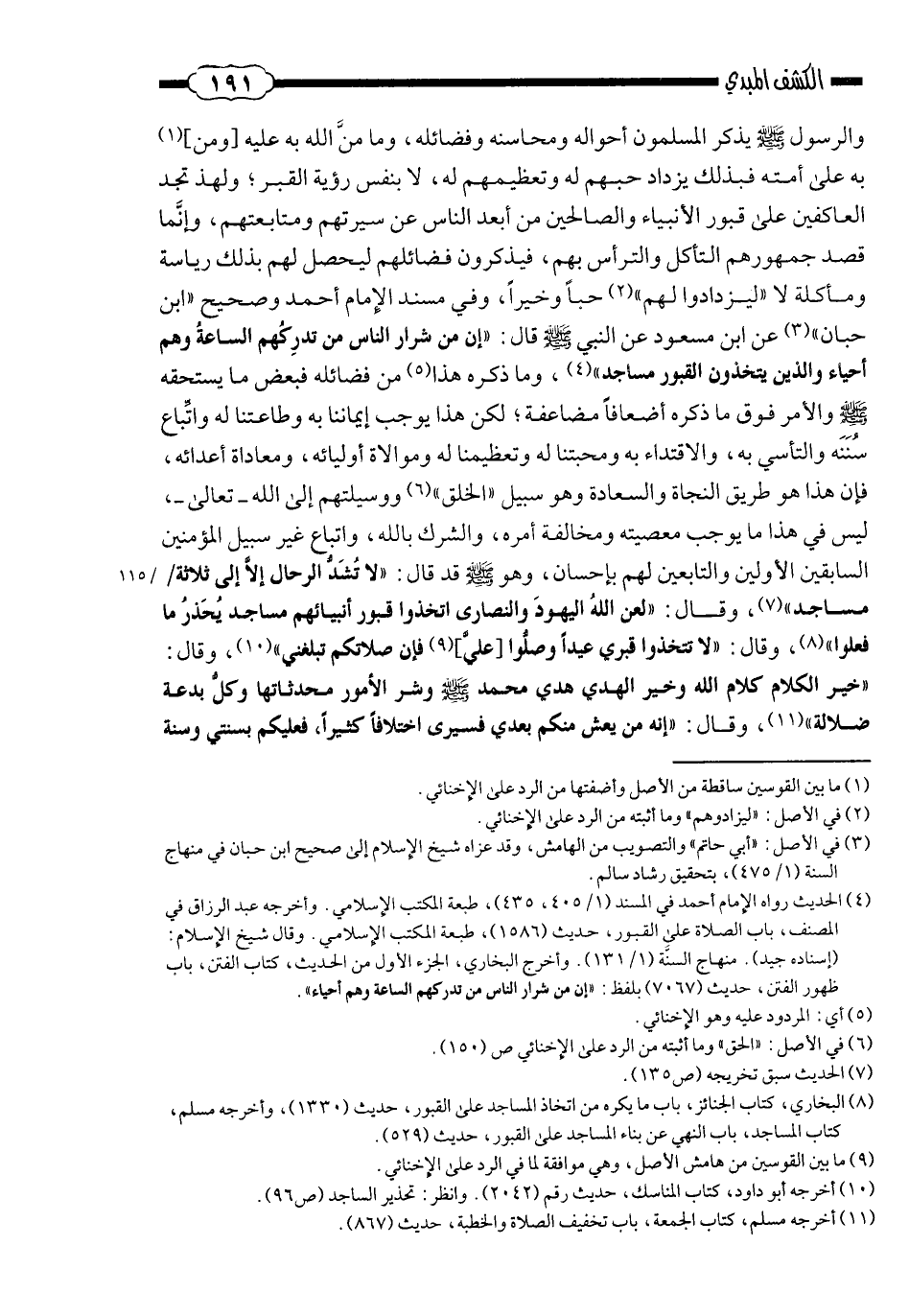 وما ذكره هذا من فضائله فبعضّ ما يستحقّه صلى الله عليه وسلم، والأمر فوق ما ذكره أضعافًا مضاعفة، لكن هذا يوجب إيماننا به، وطاعتنا له، واتّباع سُنّته، والتّأسي به، والاقتداء به، ومحبّتنا له، وتعظيمنا له، موالاة أوليائه، ومعاداة أعدائه؛ فإنّ هذا هو طريق النّجاة والسّعادة، وهو سبيل الحقّ ووسيلتهم إلى الله ـ تعالى ـ، ليس في هذا ما يوجب معصيته ومخالفة أمره والشّرك بالله واتّباع غير سبيل المؤمنين السّابقين الأوّلين والتّابعين لهم بإحسان، وهو صلى الله عليه وسلم قد قال: «لا تُشدّ الرّحال إلَّا إلى ثلاثة مساجد» ، وقال: لعن الله اليهود والنّصارى؛ اتّخذوا قبور أنبيائهم مساجد» ؛ يحذّر ما فعلوا، وقال: «لا تتّخذوا قبري عيدًا، وصلّوا [عليّ] ؛ فإنّ صلاتكم تبلغني» ، وقال: «خير الكلام كلام الله، وخير الهدي هدي محمّد صلى الله عليه وسلم، وشرّ الأمور محدثاتها، وكلّ بدعة ضلالة» ، وقال: «إنّه مَن يعش منكم بعدي فسيرى اختلافًا كثيرًا؛ فعليكم بسُنّتي وسُنّة