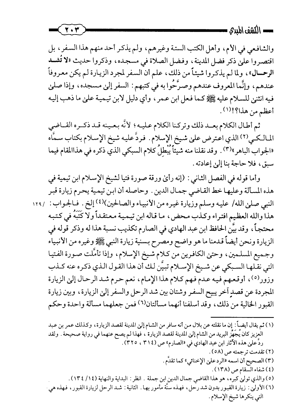 والشّافعيّ في «الأُمّ» وأهل الكتب السّتّة وغيرهم؛ لم يذكر أحد منهم هذا السّفر؛ بل اقتصروا على ذكر: فضل المدينة، وفضل الصّلاة في مسجده، وذكروا حديث: «لا تُشَدّ الرّحال ... » ، ولما لم يذكروا شيئًا من ذلك؛ عُلِمَ أنّ السّفر لمجرد الزّيارة لم يكن معروفًا عندهم؛ وإنّما المعروف عندهم وصرّحوا به في كتبهم: السّفر إلى مسجده، وإذا صلّى فيه انثنى للسّلام عليه صلى الله عليه وسلم ـ كما فعل ابن عمر ـ، وأيّ دليل لابن تيميّة على ما ذهب إليه أعظم من هذا؟!