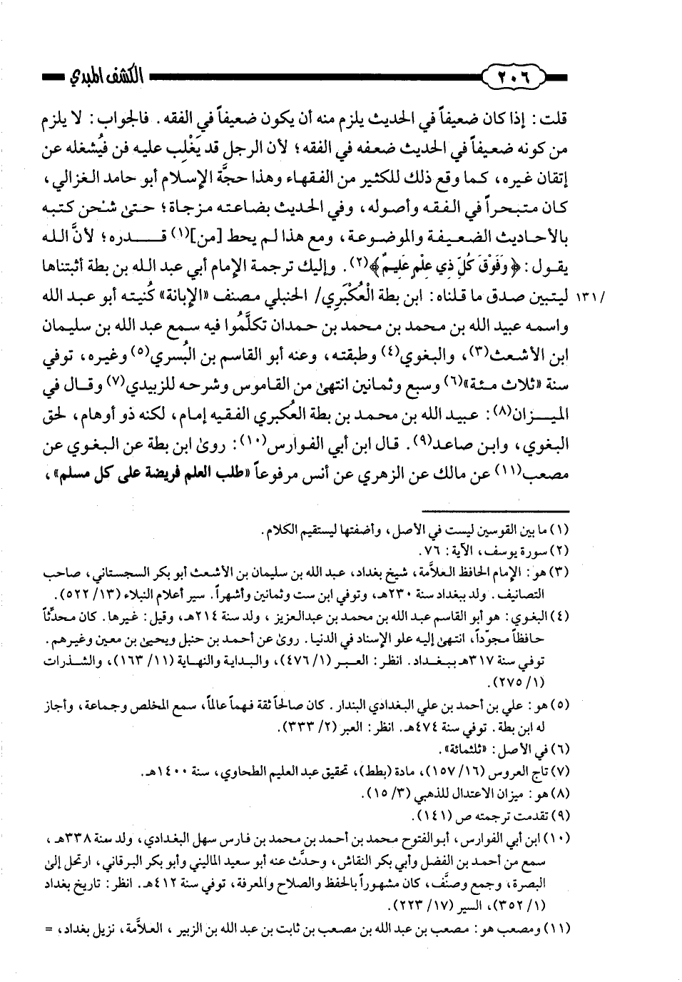 وقال في «الميزان» : «عبيد الله بن محمد بن بطّة العُكبريّ، الفقيه، إمام، لكنّه ذو أوهام، لحق البغويّ وابن صاعد. قال ابن أبي الفوارس: روى ابن بطّة عن البغويّ عن مصعب عن مالك عن الزّهريّ عن أنس مرفوعًا: «طلب العلم فريضة على كلّ مسلم» ،