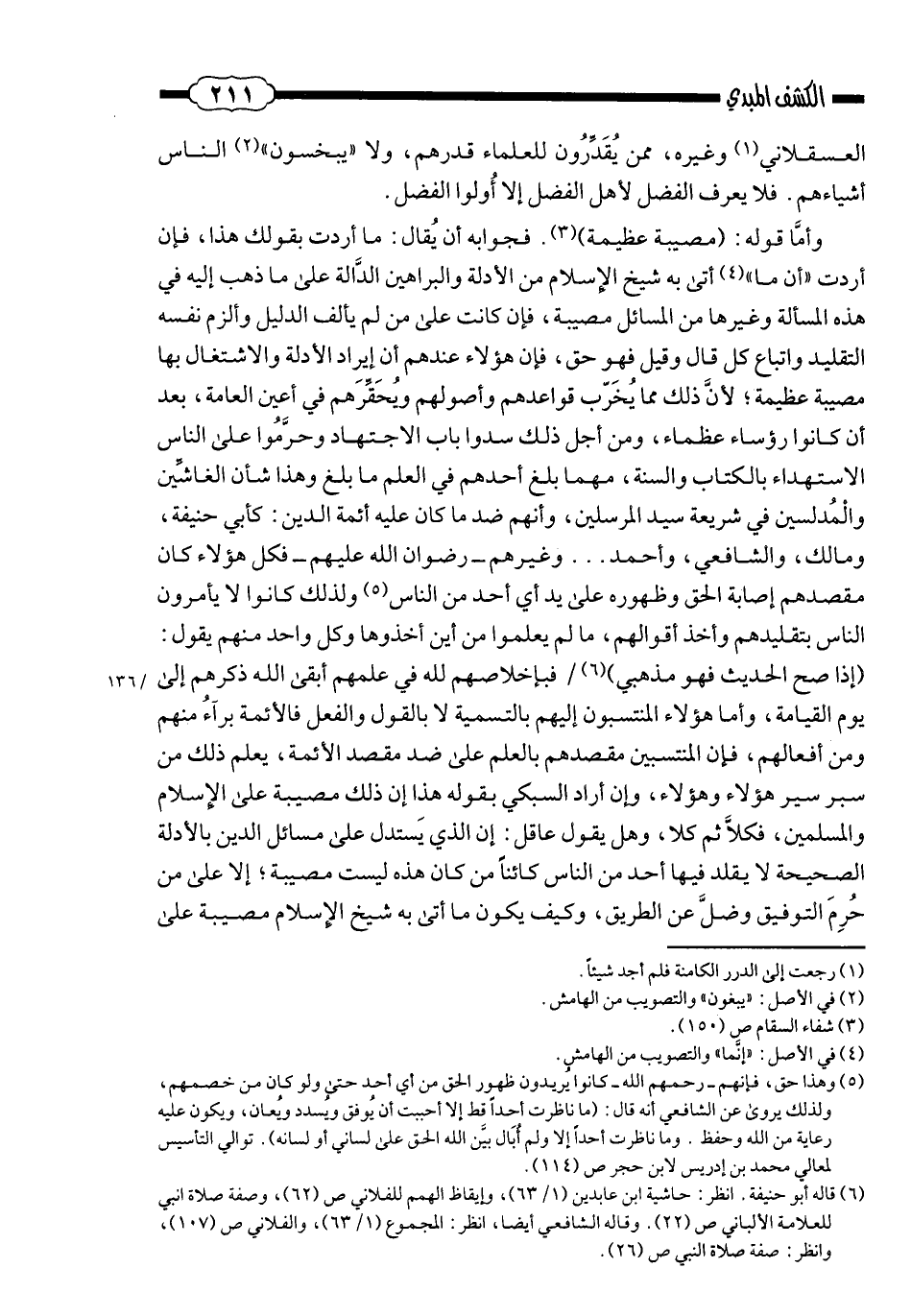 فجوابه أن يُقال: ما أردتَ بقولك هذا؟! فإن أردتَ: أنّ ما أتى به شيخ الإسلام من الأدِلّة والبراهين الدّالّة على ما ذهب إليه في هذه المسألة وغيرها من المسائل مصيبة؛ فإن كانت على مَن لم يألف الدّليل، وألزم نفسه التّقليد واتّباع كلّ قال وقيل؛ فهو حقّ؛ فإنّ هؤلاء عندهم أنّ إيراد الأدِلّة والاشتغال بها مصيبة عظيمة؛ لأنّ ذلك مما يُخَرّب قواعدهم وأصولهم ويُحقّرهم في أعين العامّة، بعد أن كانوا رؤساء عظماء، ومن أجل ذلك؛ سدّوا باب الاجتهاد، وحرّموا على النّاس الاستهداء بالكتاب والسُّنّة، مهما بلغ أحدهم في العلم ما بلغ، وهذا شأن الغاشّين والمدلّسين في شريعة سيد المرسلين، وأنّهم ضدّ ما كان عليه أئمّة الدّين ـ كأبي حنيفة ومالك والشّافعيّ وأحمد ... وغيرهم (رضوان الله عليهم) ـ؛ فكلّ هؤلاء كان مقصدهم إصابة الحقّ وظهوره على يد أيّ أحد من النّاس؛ ولذلك كانوا لا يأمرون النّاس بتقليدهم وأخذ أقوالهم، ما لم يعلموا من أين أخذوها، وكلّ واحد منهم يقول: «إذا صَحّ الحديث فهو مذهبي» ؛ فبإخلاصهم لله في علمهم أبقى الله ذكرهم إلى يوم القيامة، وأمّا هؤلاء المنتسبون إليهم بالتّسمية ـ لا بالقول والفعل ـ؛ فالأئمّة بُراء منهم ومن أفعالهم؛ فإنّ المنتسبين مقصدهم بالعلم على ضدّ مقصد الأئمّة؛ يعلم ذلك من سبر سير هؤلاء وهؤلاء.