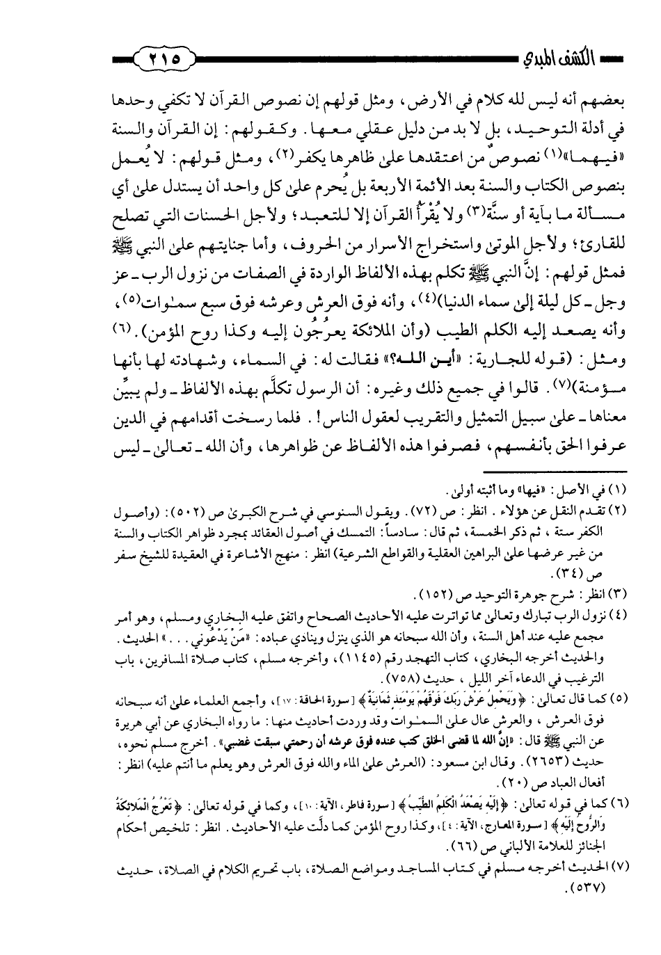 بعضهم أنّه ليس لله كلام في الأرض. ومثل قولهم: إنّ نصوص القرآن لا تكفي وحدها في أدِلّة التّوحيد؛ بل لا بُدّ من دليل عقليّ معها! وكقولهم: إنّ القرآن والسُّنّة فيهما نصوص مَن اعتقدها على ظاهرها يكفر! ومثل قولهم: لا يُعمل بنصوص الكتاب والسُّنّة بعد الأئمّة الأربعة؛ بل يحرم على كلّ أحد أن يستدلّ على أيّ مسألة ما بآية أو سُنّة، ولا يُقرأ القرآن إلَّا للتّعبّد، ولأجل الحسنات التي تحصل للقارئ، ولأجل الموتى، واستخراج الأسرار من الحروف!