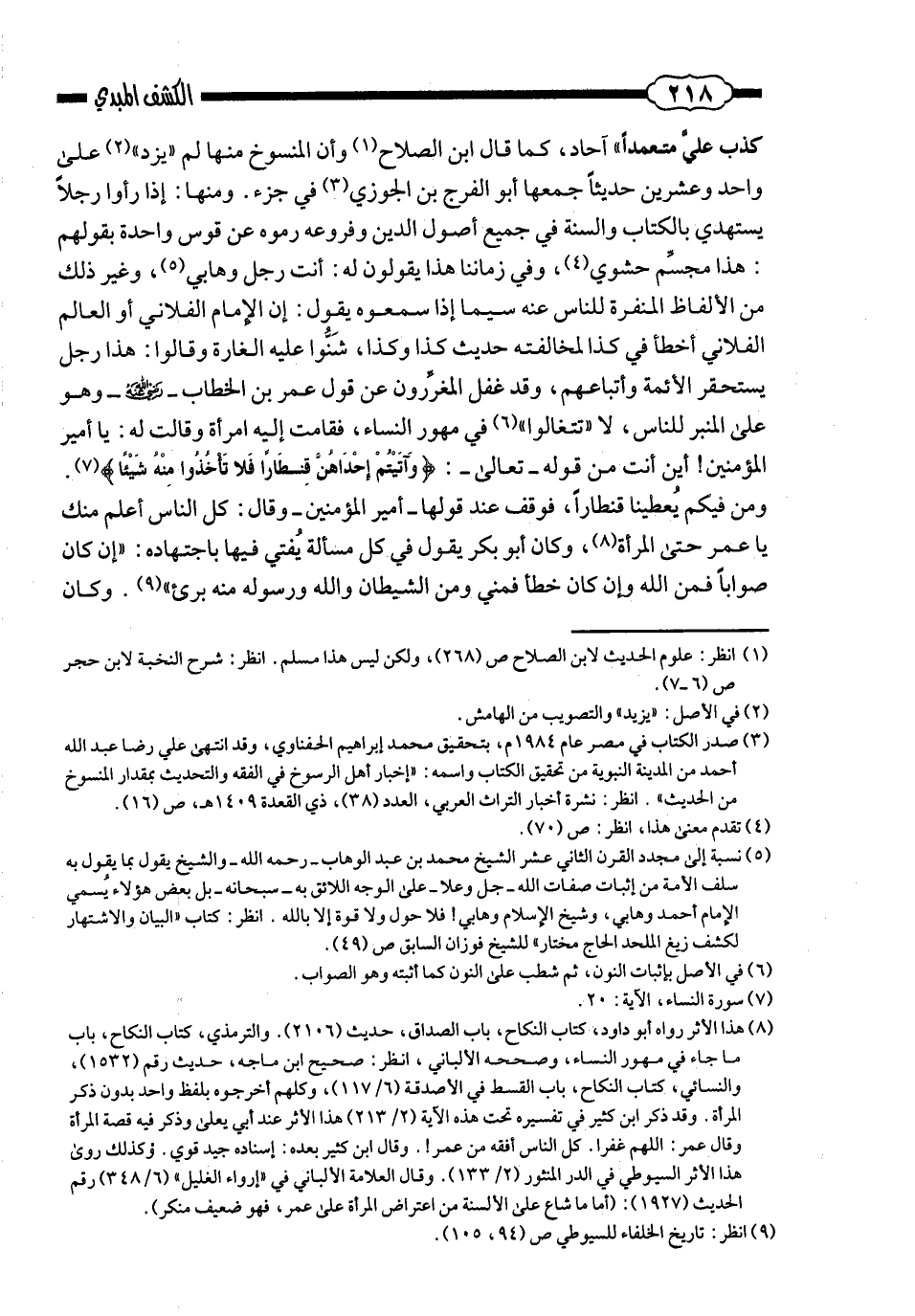 ومنها: إذا رأوا رجلًا يستهدي بالكتاب والسُّنّة في جميع أصول الدّين وفروعه؛ رموه عن قوس واحدة بقولهم: هذا مجسّم حشويّ! وفي زماننا هذا يقولون له: أنتَ رجل وهابي! وغير ذلك من الألفاظ المنفّرة للنّاس عنه، سيّما إذا سمعوه يقول: إنّ الإمام الفلانيّ أو العالم الفلانيّ أخطأ في كذا؛ لمخالفته حديث كذا وكذا؛ شنّوا عليه الغارة؛ وقالوا: هذا رجل يستحقر الأئمّة وأتباعهم، وقد غفل المغرّرون عن قول عمر بن الخطاب ـ رضي الله عنه ـ وهو على المنبر للنّاس: لا تتغالوا في مهور النّساء؛ فقامت إليه امرأة وقالت له: يا أمير المؤمنين؛ أين أنتَ من قوله ـ تعالى ـ: «وآتيتُم إحداهنّ قنطارًا فلا تأخذوا منه شيئًا» ، ومَن فيكم يعطينا قنطارًا؟! فوقف عند قولها أمير المؤمنين، وقال: «كلّ النّاس أعلم منك يا عمر، حتى المرأة» ! وكان أبو بكر يقول في كلّ مسألة يفتي فيها باجتهاده: «إن كان صوابًا فمن الله، وإن كان خطأ فمنّي ومن الشّيطان؛ والله ورسوله منه بريء» ، وكان