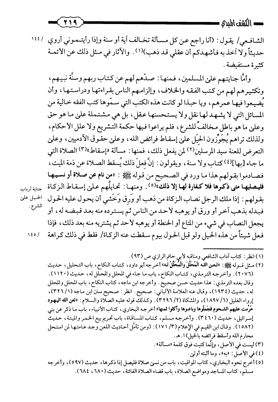 وأمّا جنايتهم على المسلمين: فمنها: صدّهم لهم عن كتاب ربّهم وسُنّة نبيّهم، وتكثيرهم لهم من كتب الفقه والخلاف، وإلزامهم النّاس بقراءتها ودراستها، وأن يضيعوا فيها عمرهم، ويا حبذا لو كانت هذه الكتب التي سمّوها كتب الفقه خالية من المسائل التي لا يشهد لها نقل ولا يستحسنها عقل؛ بل هي مشتملة على ما هو حقّ وعلى ما هو باطل مخالف للشّرع؛ فلم يراعوا فيها حكمة التّشريع ولا علل الأحكام؛ ولذلك تراهم يجوّزون الحيل على إسقاط فرائض الله وعلى حقوق الآدميّين، وعلى التّعرّض للعنة سيد المرسلين لمن يفعل ذلك.