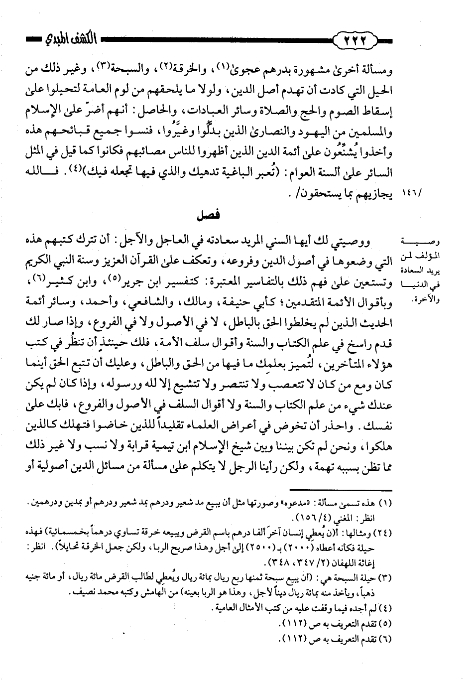 ووصيّتي لك أيّها السُّنّيّ المريد سعادته في العاجل والآجل: أن تترك كتبهم هذه التي وضعوها في أصول الدّين وفروعه، وتعكف على القرآن العزيز وسُنّة النّبيّ الكريم، وتستعين على فهم ذلك بالتّفاسير المعتبرة ـ كتفسير ابن جرير وابن كثير ـ، وبأقوال الأئمّة المتقدّمين ـ كأبي حنيفة ومالك والشّافعيّ وأحمد ـ، وسائر أئمّة الحديث الذين لم يخلطوا الحقّ بالباطل، لا في الأصول ولا في الفروع. وإذا صار لك قدم راسخ في علم الكتاب والسُّنّة وأقوال سلف الأُمّة؛ فلك ـ حينئذ ـ أن تنظر في كتب هؤلاء المتأخّري؛ لتميّز بعلمك ما فيها من الحقّ والباطل، وعليك أن تتبع الحقّ أينما كان، ومع مَن كان، لا تتعصّب ولا تنتصر ولا تتشيّع إلَّا لله ورسوله. وإذا كان لم يكن عندك شيء من علم الكتاب والسُّنّة ولا أقوال السّلف في الأصول والفروع؛ فابكِ على نفسك! واحذر أن تخوض في أعراض العلماء تقليدًا للذين خاضوا؛ فتهلك كالذين هلكوا. ونحن لم تكن بيننا وبين شيخ الإسلام ابن تيميّة قرابة ولا نسب ولا غير ذلك مما تظنّ بسببه تهمة؛ ولكن رأينا الرّجل لا يتكلّم على مسألة من مسائل الدّين ـ أصوليّة أو