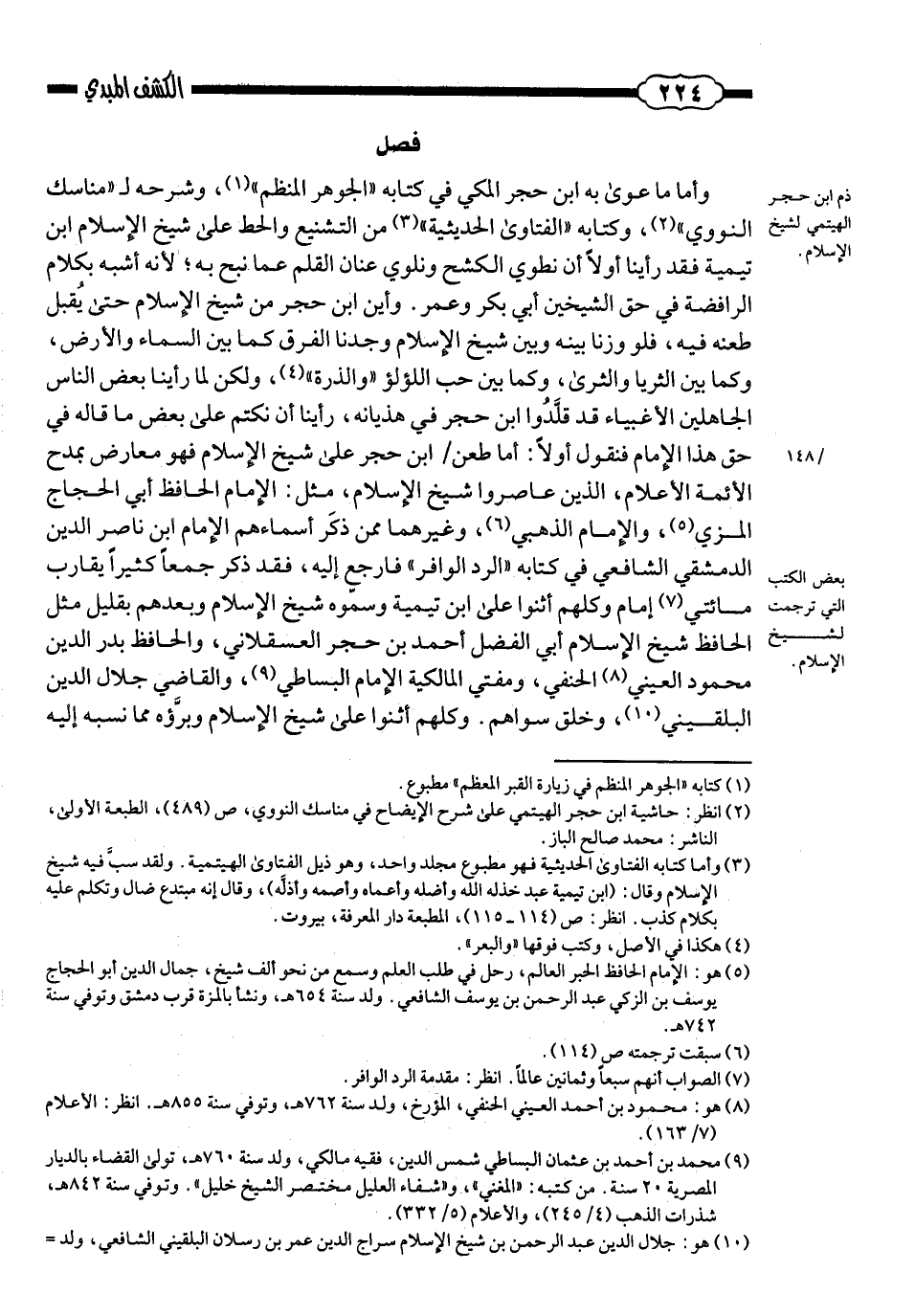 وأمّا ما عوى به ابن حجر المكيّ في كتابه «الجوهر المنظم» وشرحه لـ «مناسك النّووي» وكتابه «الفتاوى الحديثيّة» ؛ من التّشنيع والحطّ على شيخ الإسلام ابن تيميّة؛ فقد رأينا ـ أولًا ـ أن نطوي الكشح ونلوي عنان القلم عمّا نبح به؛ لأنّه أشبه بكلام الرّافضة في حقّ الشّيخين أبي بكر وعمر. وأين ابن حجر من شيخ الإسلام حتى يُقبل طعنه فيه؟! فلو وزنّا بينه وبين شيخ الإسلام؛ وجدنا الفرق كما بين السّماء والأرض، وكما بين الثّريا والثّرى، وكما بين حبّ اللؤلؤ والذّرة، ولكن لما رأينا بعض النّاس الجاهلين الأغبياء قد قلّدوا ابن حجر في هذيانه؛ رأينا أن نتكلّم على بعض ما قاله في حقّ هذا الإمام؛ فنقول: