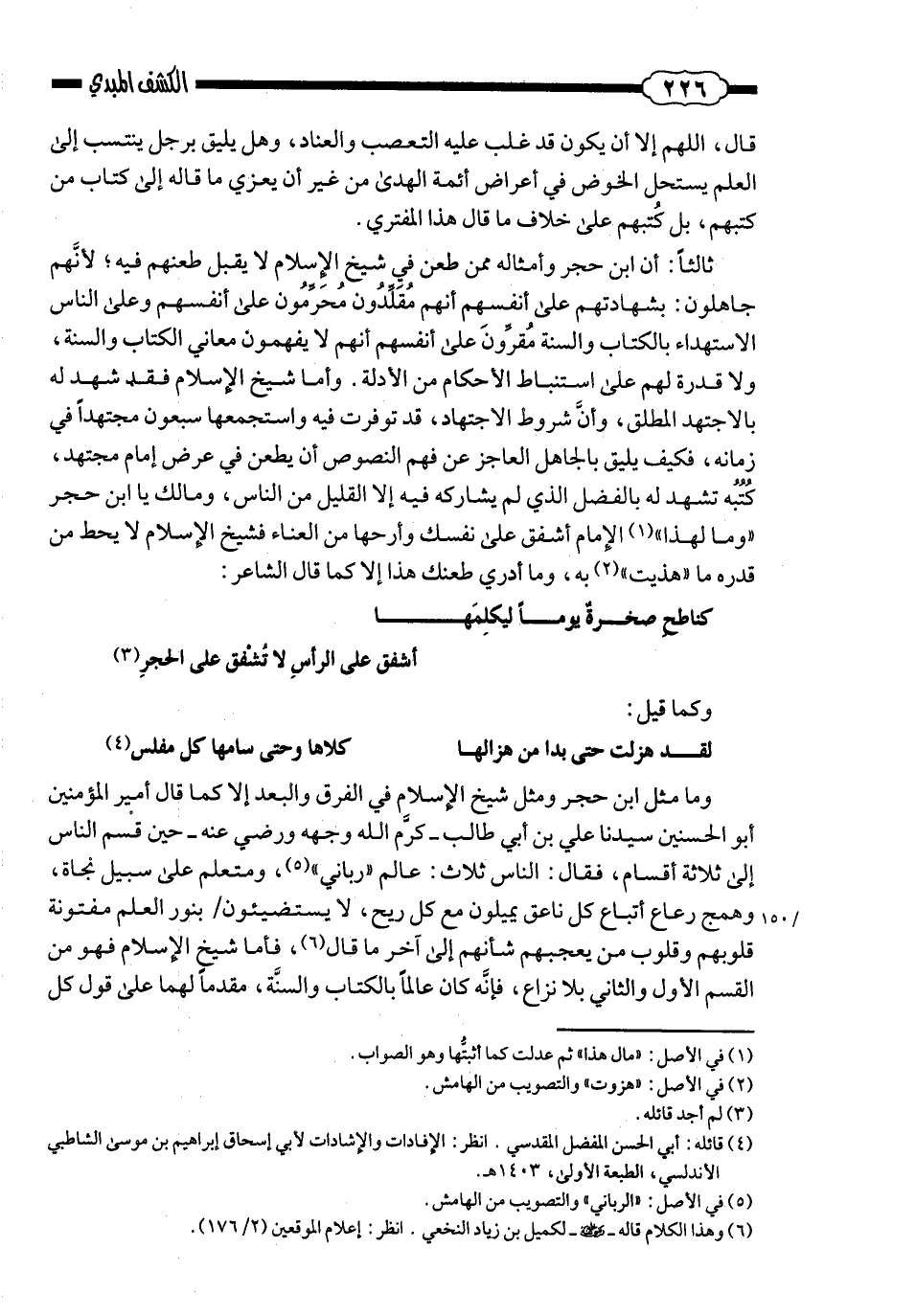 وما مثل ابن حجر ومثل شيخ الإسلام في الفرق والبعد إلَّا كما قال أمير المؤمنين أبو الحسنين سيدنا عليّ بن أبي طالب ـ كرّم الله وجهه ورضي عنه ـ، حين قسّم النّاس إلى ثلاثة أقسام؛ فقال: «النّاس ثلاث: عالم ربانيّ ومتعلّم على سبيل نجاة، وهمج رعاع أتباع كلّ ناعق، يميلون مع كلّ ريح، لا يستضيئون بنور العلم، مفتونة قلوبهم وقلوب مَن يعجبهم شأنهم ... » إلى آخر ما قال. فأمّا شيخ الإسلام فهو من القسم الأوّل والثّاني ـ بلا نزاع ـ؛ فإنّه كان عالمًا بالكتاب والسُّنّة، مقدمًا لهما على قول كلّ