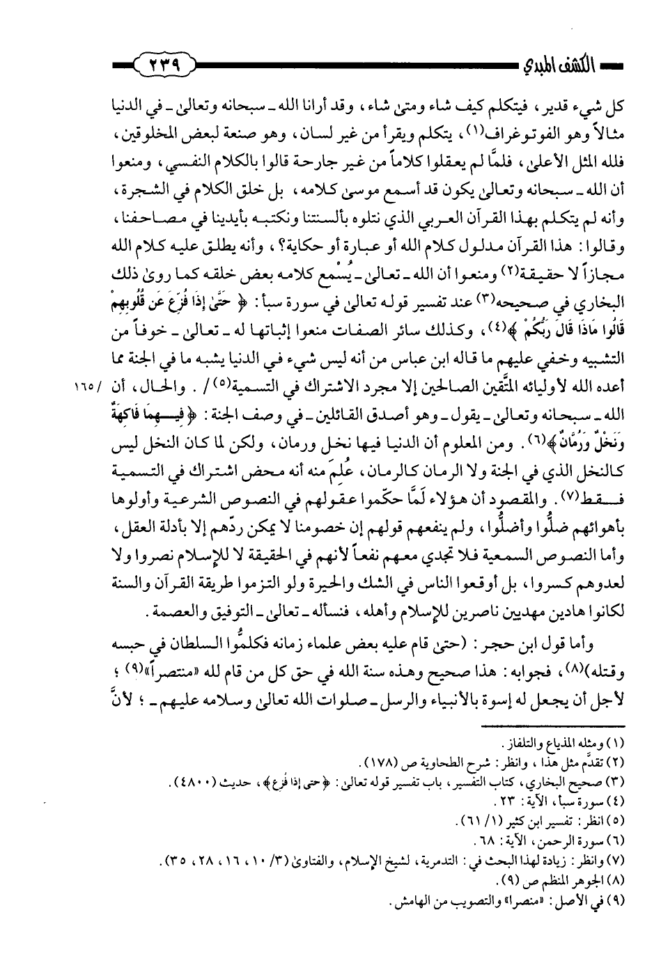 كلّ شيء قدير؟! فيتكلّم كيف شاء ومتى شاء، وقد أرانا الله ـ سبحانه وتعالى ـ في الدُّنيا مثالًا؛ وهو الفوتوغراف؛ يتكلّم ويقرأ من غير لسان، وهو صنعة لبعض المخلوقين؛ فلله المثل الأعلى.