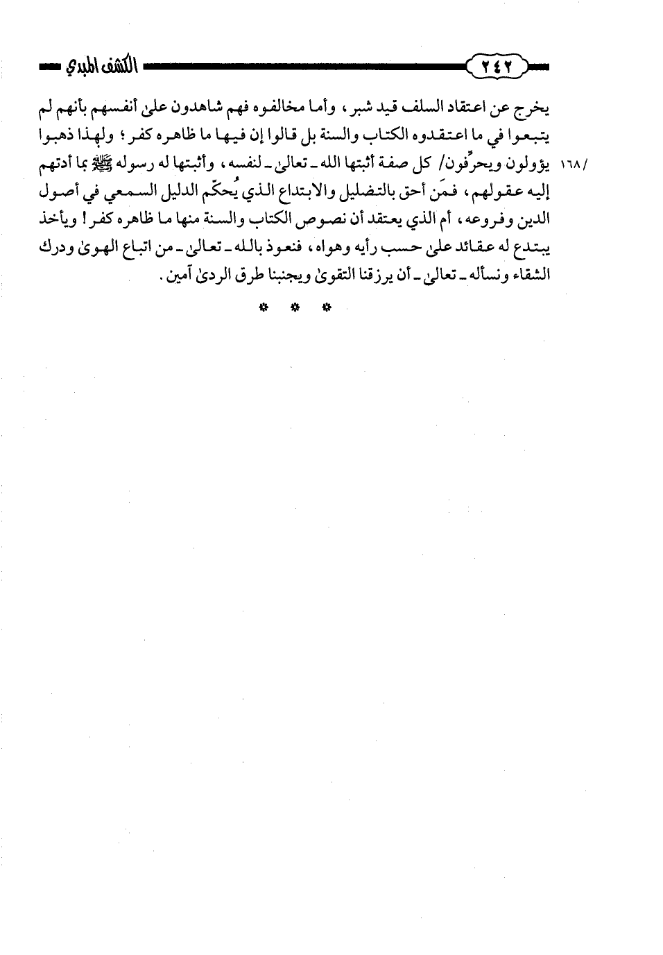 يخرج عن اعتقاد السّلف قيد شبر، وأمّا مخالفوه؛ فهم شاهدون على أنفسهم بأنّهم لم يتبعوا فيما اعتقدوه الكتاب والسُّنّة؛ بل قالوا: إنّ فيهما ما ظاهره كفر! ولهذا ذهبوا يؤوّلون ويحرّفون كلّ صفة أثبتها الله ـ تعالى ـ لنفسه، وأثبتها له رسوله صلى الله عليه وسلم؛ بما أدّتهم إليه عقولهم؛ فمَن أحقّ بالتّضليل والابتداع: الذي يُحكّم الدّليل السّمعيّ في أصول الدّين وفروعه، أم الذي يعتقد أنّ نصوص الكتاب والسُّنّة منها ما ظاهره كفر! ويأخذ يبتدع له عقائد على حسب رأيه وهواه؟! فنعوذ بالله ـ تعالى ـ من اتّباع الهوى ودرك الشّقاء، ونسأله ـ تعالى ـ أن يرزقنا التّقوى، ويجنبن طرق الردى، آمين.