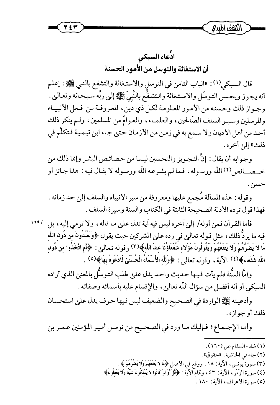 اعلم أنّه يجوز ويحسن التّوسّل والاستغاثة والتّشفّع بالنّبيّ صلى الله عليه وسلم إلى ربّه ـ سبحانه وتعالى ـ؛ وجواز ذلك وحسنه من الأمور المعلومة لكلّ ذي دين، المعروفة من فعل الأنبياء والمرسلين وسير السّلف الصّالحين والعلماء، والعوامّ من المسلمين، ولم ينكر ذلك أحد من أهل الأديان، ولا سمع به في زمن من الأزمان، حتى جاء ابن تيميّة؛ فتكلّم في ذلك ... » إلى آخره!