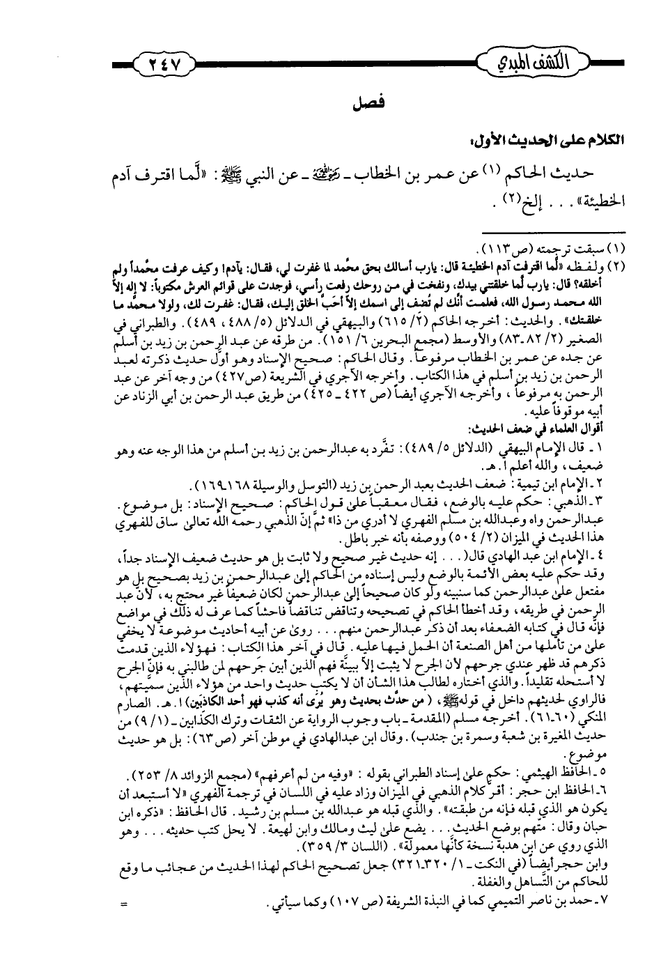 حديث الحاكم: عن عمر بن الخطاب ـ رضي الله عنه ـ عن النّبيّ صلى الله عليه وسلم: «لما اقترف آدم الخطيئة ... » إلخ.
