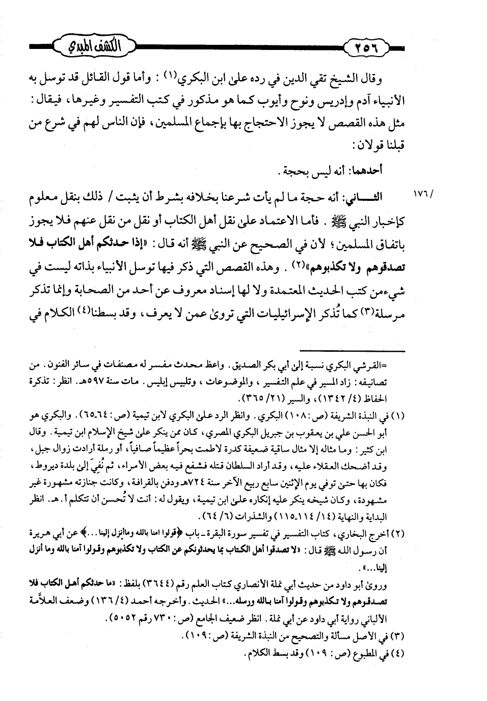 الثّاني: أنّه حُجّة ما لم يأتِ شرعنا بخلافه، بشرط أن يثبت ذلك بنقل معلوم ـ كإخبار النّبيّ صلى الله عليه وسلم ـ. فأمّا الاعتماد على نقل أهل الكتاب أو نقل مَن نقل عنهم؛ فلا يجوز باتّفاق المسلمين؛ لأنّ في الصّحيح عن النّبيّ صلى الله عليه وسلم أنّه قال: «إذا حدّثكم أهل الكتاب فلا تصدّقوهم ولا تكذّبوهم» . وهذه القصص التي ذكر فيها توسل الأنبياء بذاته ليست في شيء من كتب الحديث المعتمدة، ولا لها إسناد معروف عن أحد من الصّحابة؛ وإنّما تذكر مرسلة؛ كما تُذكر في الإسرائيليّات التي تُروى عمّن لا يعرف. وقد بسطنا الكلام في