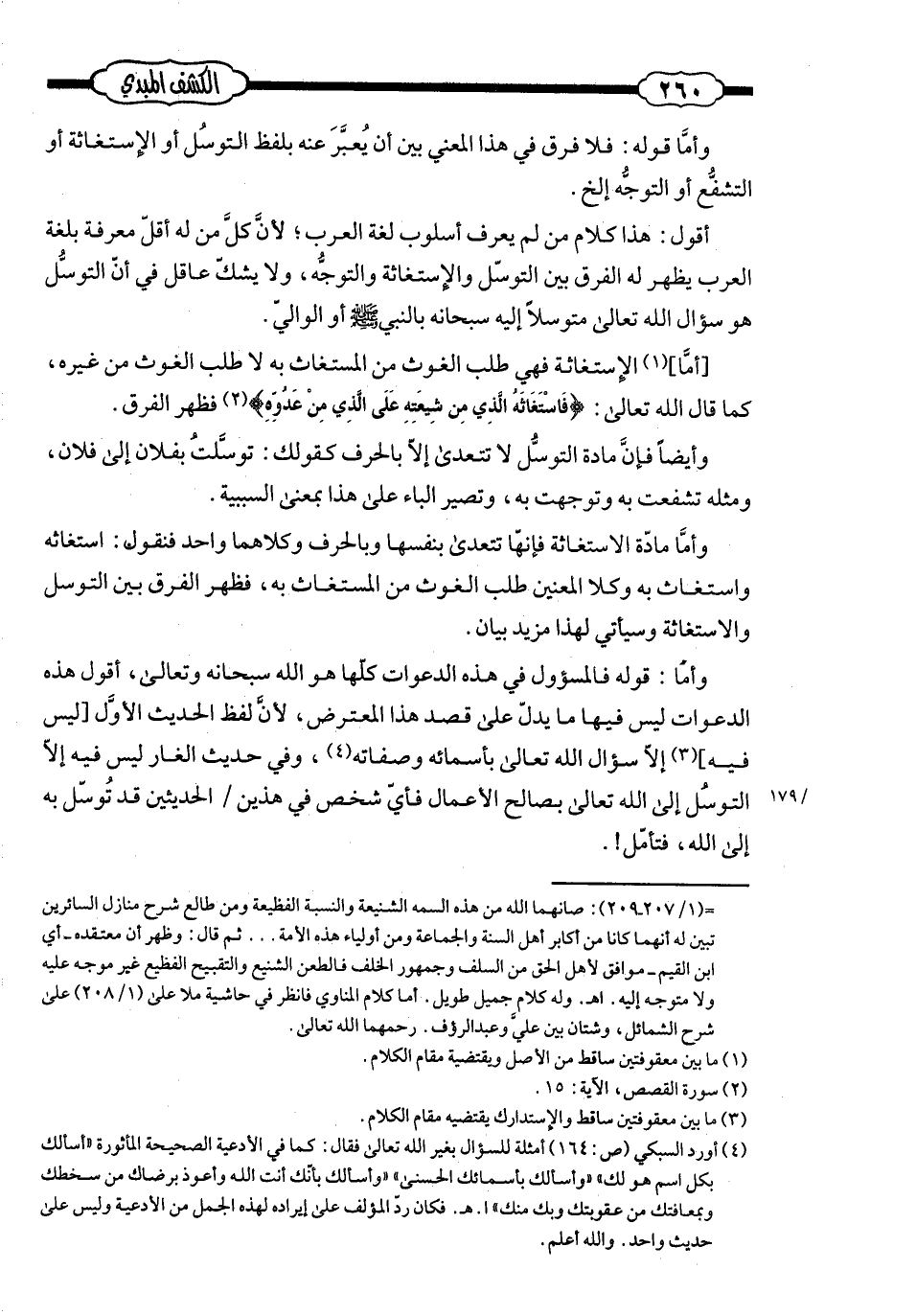 أقول: هذا كلام مَن لم يعرف أسلوب لغة العرب؛ لأنّ كلّ مَن له أقلّ معرفة بلغة العرب يظهر له الفرق بين التّوسّل والاستغاثة والتّوجّه، ولا يشكّ عاقل في أنّ التّوسّل هو سؤال الله ـ تعالى ـ متوسّلًا إليه ـ سبحانه ـ بالنّبيّ صلى الله عليه وسلم أو الوليّ.