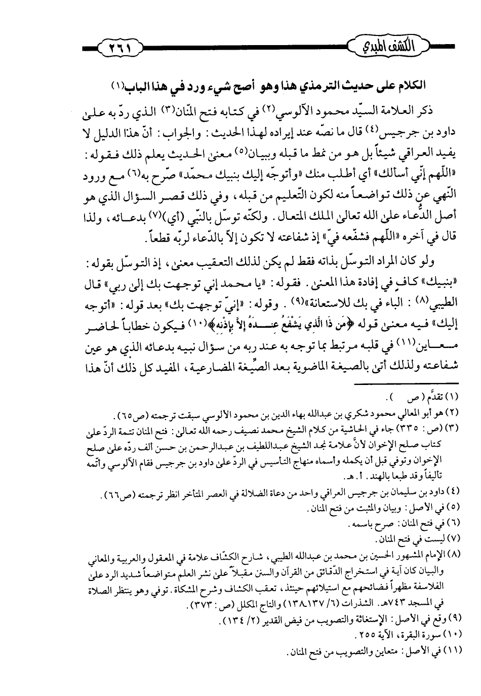 ذكر العلّامة السّيد محمود الآلوسيّ في كتابه «فتح المنّان» ـ الذي ردّ به على داود بن جرجيس ـ، قال ما نصّه ـ عند إيراده لهذا الحديث ـ:
