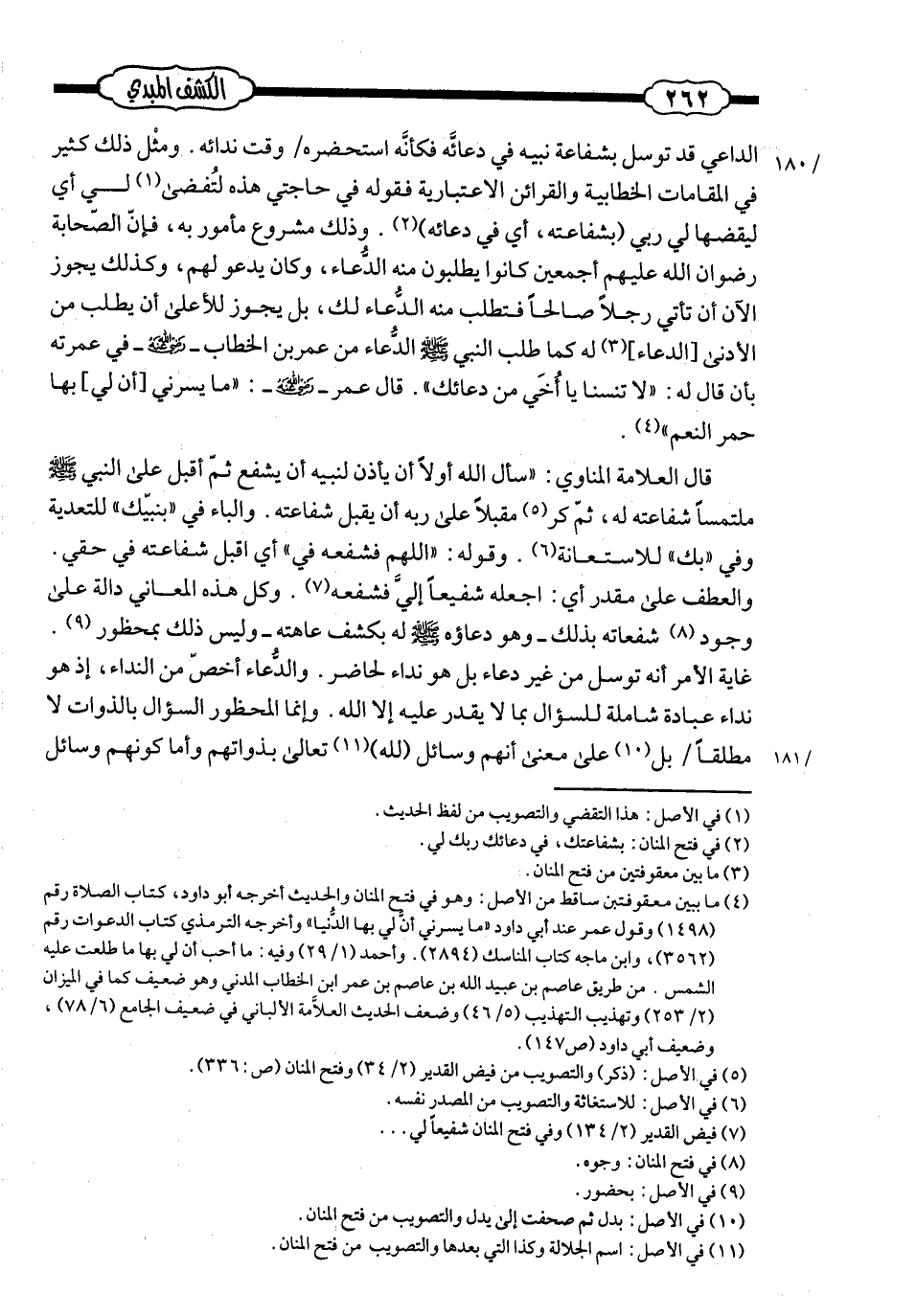 الدّاعي قد توسّل بشفاعة نبيّه في دعائه؛ فكأنّه استحضره وقت ندائه؛ ومثل ذلك كثير في المقامات الخطابيّة والقرائن الاعتباريّة؛ فقوله: «في حاجتي هذه لتفضي لي» ؛ أي: ليقضها لي ربّي (بشفاعته؛ أي: في دعائه) . وذلك مشروع مأمور به؛ فإنّ الصّحابة ـ رضوان الله عليهم أجمعين ـ كانوا يطلبون منه الدُّعاء، وكان يدعو لهم، وكذلك يجوز الآن أن تأتي رجلًا صالحًا فتطلب منه الدُّعاء لك؛ بل يجوز للأعلى أن يطلب من الأدنى [الدُّعاء] له؛ كما طلب النّبيّ صلى الله عليه وسلم الدُّعاء من عمر بن الخطّاب ـ رضي الله عنه ـ في عمرته؛ بأن قال له: «لا تنسنا يا أخي من دعائك» ؛ قال عمر ـ رضي الله عنه ـ: «ما يسرّني [أنّ لي] بها حمر النّعم» .