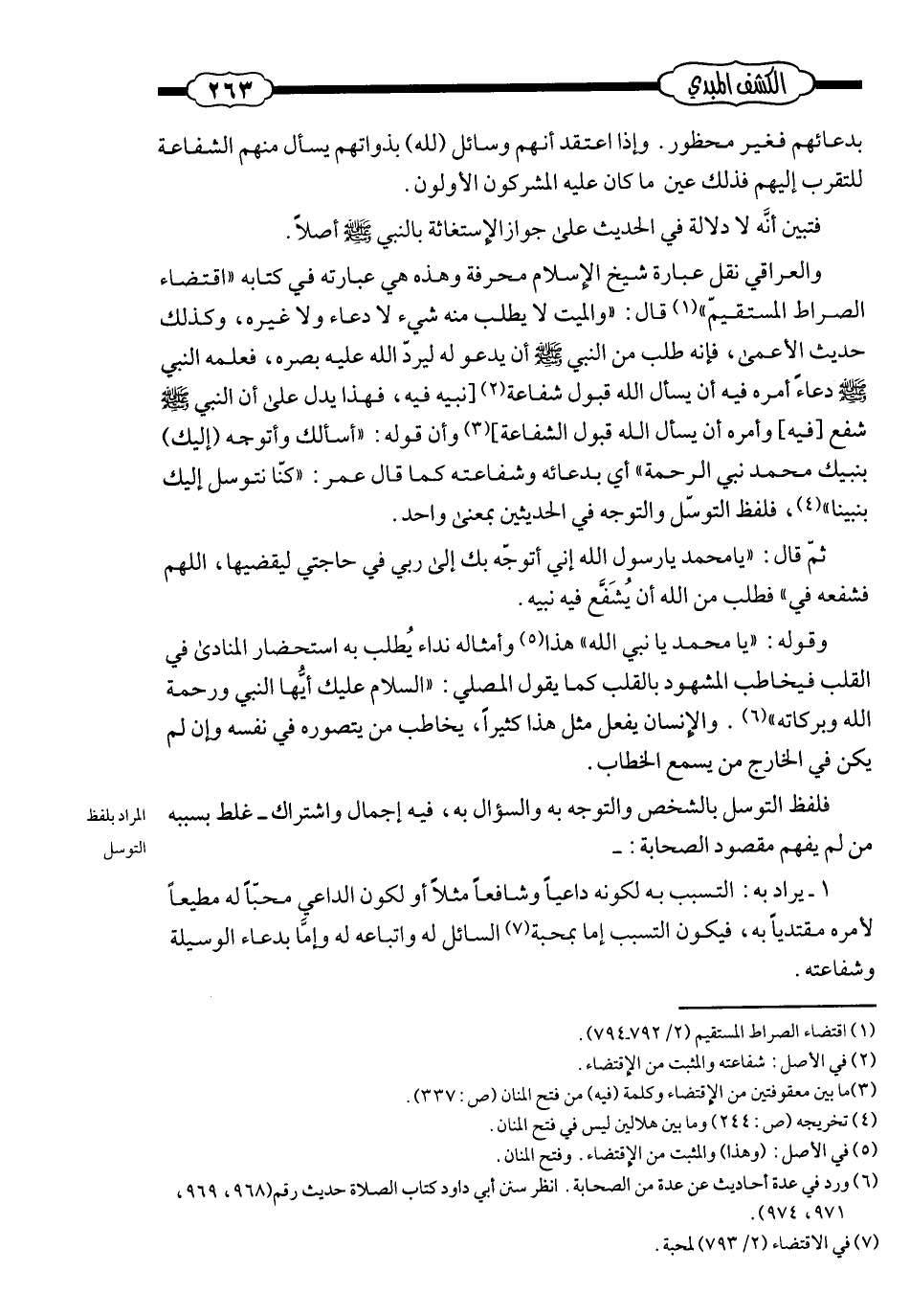 والعراقيّ نقل عبارة شيخ الإسلام محرّفة؛ وهذه هي عبارته في كتابه «اقتضاء الصّراط المستقيم» ؛ قال: «والميّت لا يطلب منه شيء، لا دعاء ولا غيره، وكذلك حديث الأعمى؛ فإنّه طلب من النّبيّ صلى الله عليه وسلم أن يدعو له ليردّ الله عليه بصره؛ فعلّمه النّبيّ صلى الله عليه وسلم دعاءً أمره فيه أن يسأل الله قبول شفاعة [نبيه فيه؛ فهذل يدلّ على أنّ النّبيّ صلى الله عليه وسلم شفع [فيه] ، وأمره أن يسأل الله قبول الشّفاعة] ، وأنّ قوله: «أسألك وأتوجّه (إليك) بنبيّك محمّد نبيّ الرّحمة» أي: بدعائه وشفاعته؛ كما قال عمر: «كنّا نتوسّل إليك بنبيّنا» ؛ فلفظ (التّوسّل) و (التّوجّه) في الحديثين بمعنى واحد. ثم قال: «يا محمّد يا رسول الله؛ إنّي أتوجّه بك إلى ربّي في حاجتي ليقضيها؛ اللهمّ فشفّعه فيّ» ؛ فطلب من الله أن يشفّع فيه نبيّه.
