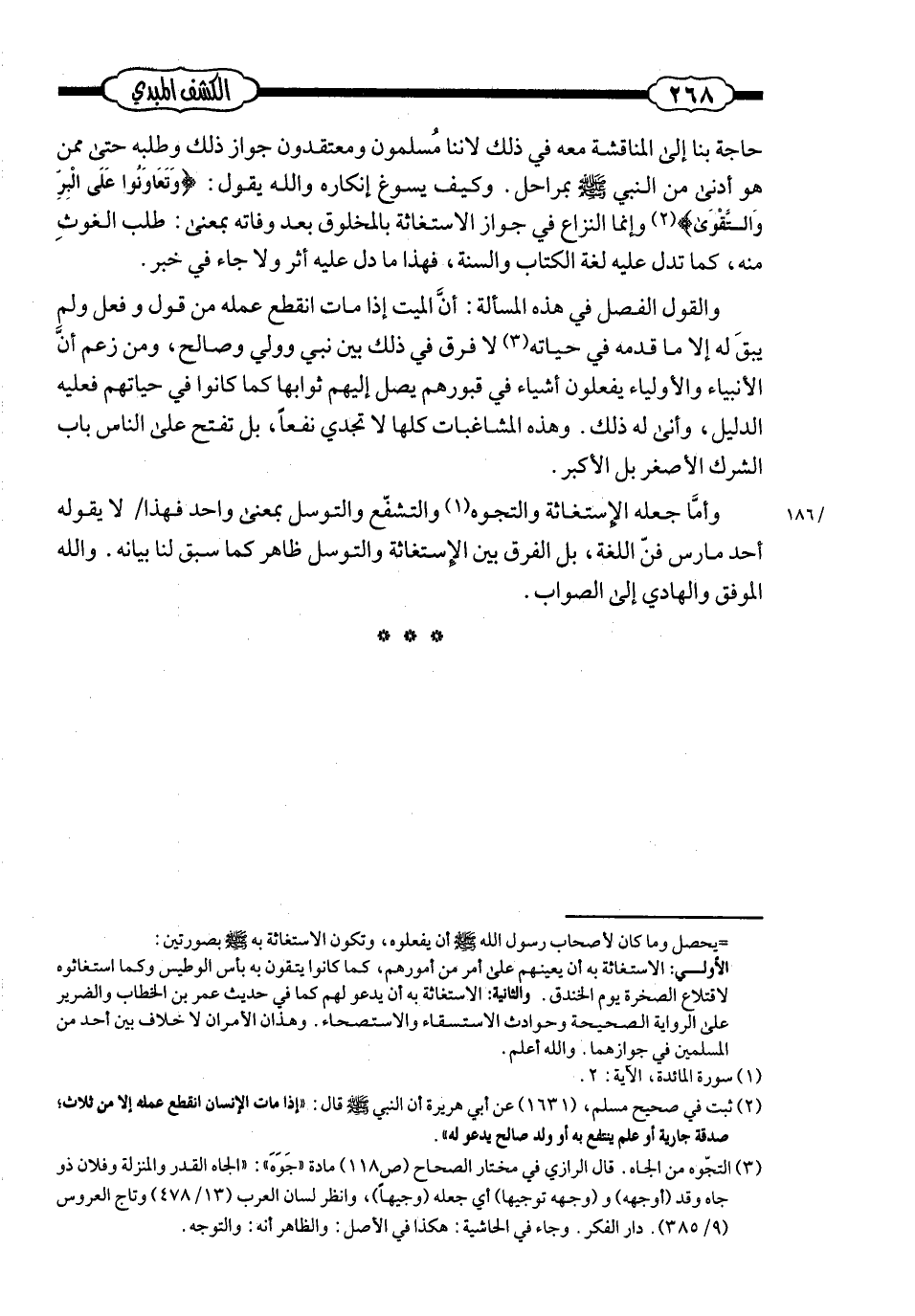 وأمّا جعله (الاستغاثة) و (التّجوّه) و (التّشفّع) و (التّوسّل) بمعنى واحد؛ فهذا لا يقوله أحد مارس فنّ اللّغة؛ بل الفرق بين (الاستغاثة) و (التّوسّل) ظاهر ـ كما سبق لنا بيانه ـ. والله الموفّق والهادي إلى الصّواب.