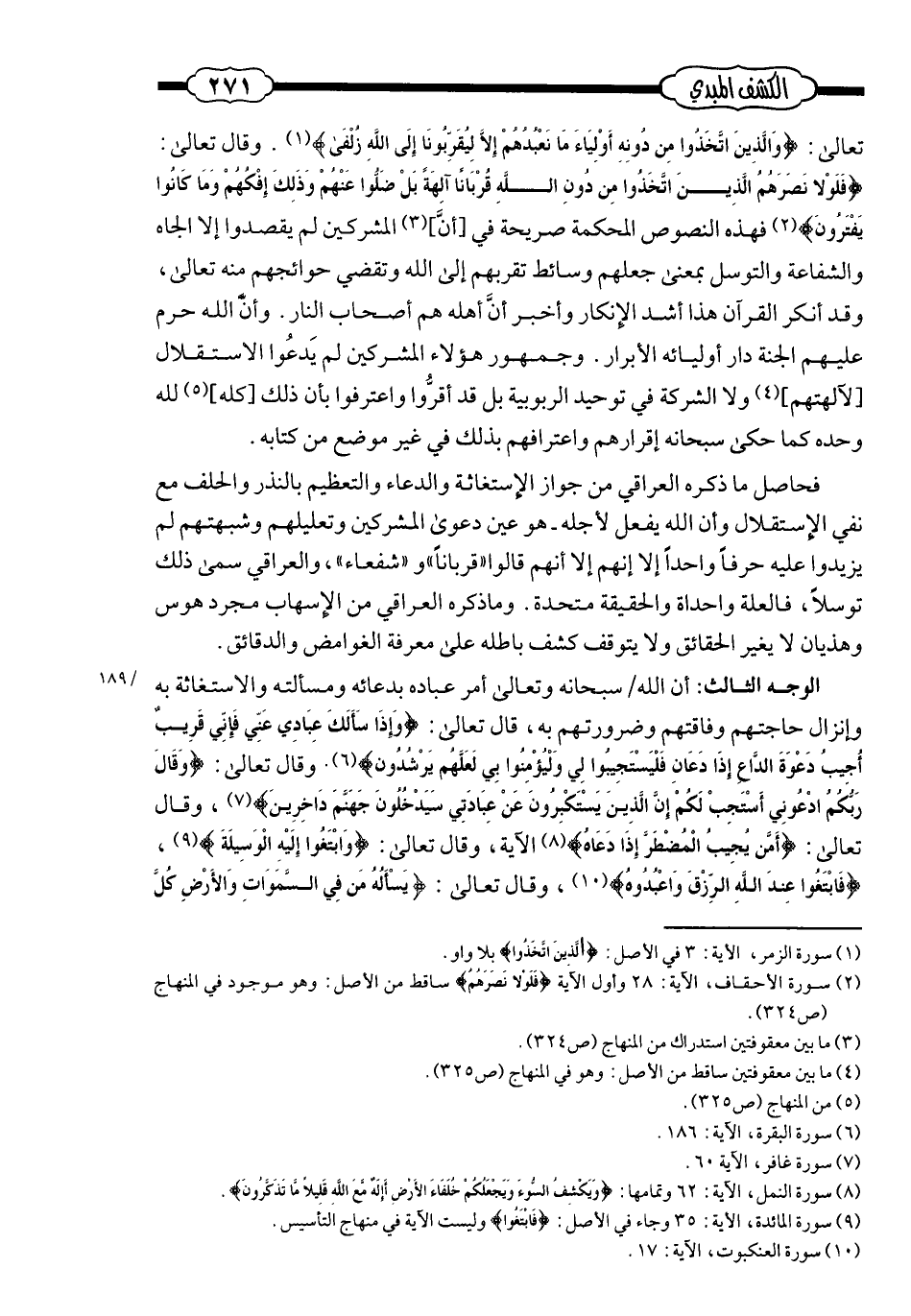 ـ تعالى ـ: {والذين اتخذوا من دونه أولياء ما نعبدهم إلَّا ليقربونا إلى الله زلفى} ، وقال ـ تعالى ـ {فلولا نصرهم الذين اتخذوا من دون الله قربانًا آلهة بل ضلّوا عنهم وذلك إفكهم وما كانوا يفترون} ؛ فهذه النّصوص المحكمة صريحة في [أنّ] المشركين لم يقصدوا إلَّا الجاه والشّفاعة والتّوسّل ـ بمعنى: جعلهم وسائط تقرّبهم إلى الله وتقضي حوائجهم منه (تعالى) ـ، وقد أنكر القرآن هذا أشدّ الإنكار؛ وأخبر أنّ أهله هم أصحاب النّار، وأنّ الله حرّم عليهم الجنّة دار أوليائه الأبرار، وجمهور هؤلاء المشركين لم يَدّعوا الاستقلال [لآلهتهم] ولا الشّركة في توحيد الرّبوبيّة؛ بل قد أقرّوا واعترفوا بأنّ ذلك [كلّه] لله وحده؛ كما حكى ـ سبحانه ـ إقرارهم واعترافهم بذلك في غير موضع من كتابه.