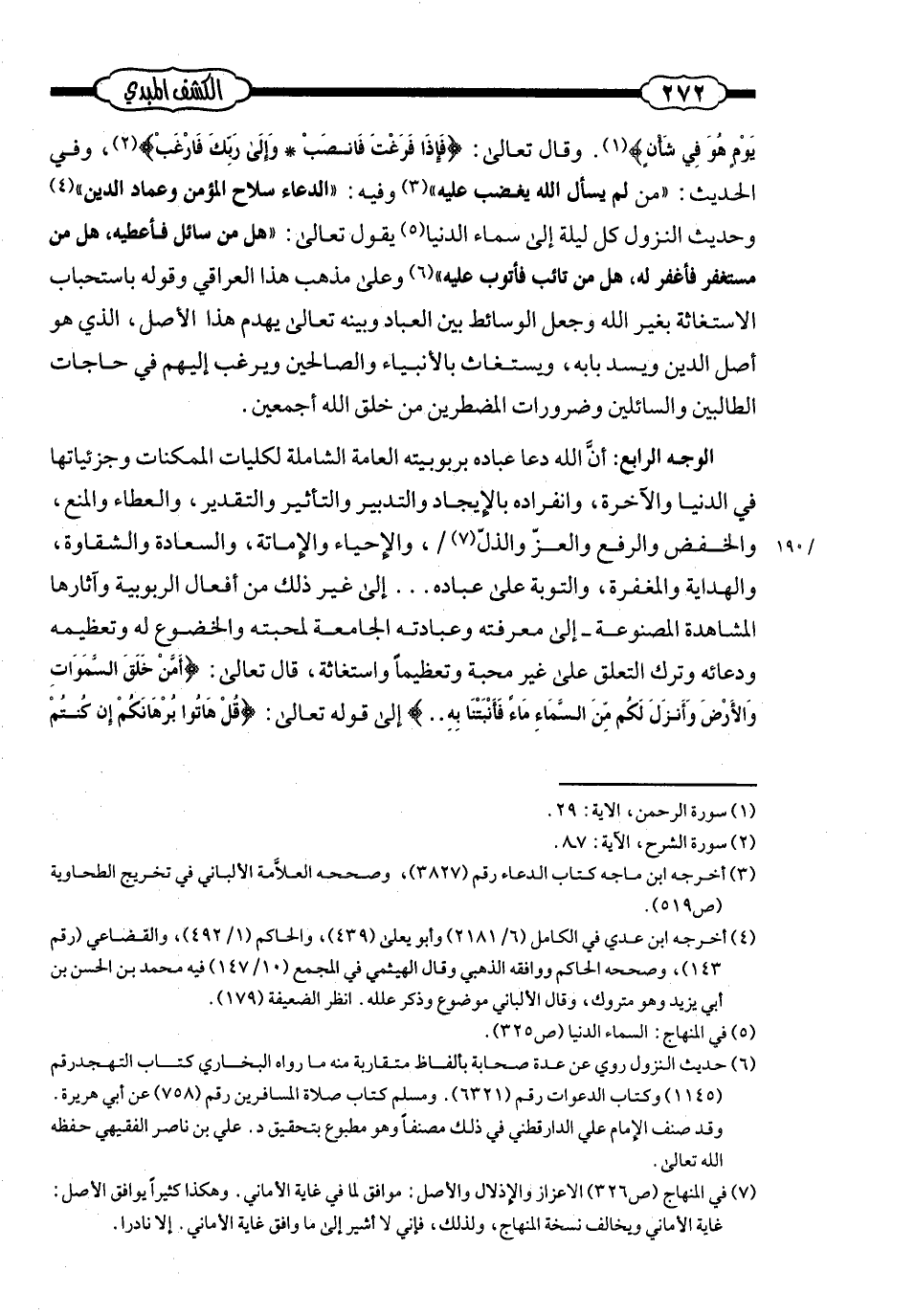 يوم هو في شأن} ، وقال ـ تعالى ـ: {فإذا فرغتَ فانصب * وإلى ربّك فارغب} ، وفي الحديث: «مَن لم يسأل الله يغضب عليه» ، وفيه: «الدُّعاء سلام المؤمن وعماد الدّين» ، وحديث النّزول كلّ ليلة إلى سماء الدُّنيا؛ يقول ـ تعالى ـ: «هل من سائل فأعطيه، هل من مستغفر فأغفر له، هل من تائب فأتوب عليه؟» . وعلى مذهب هذا العراقيّ، وقوله باستحباب الاستغاثة بغير الله، وجعل الوسائط بين العباد وبينه ـ تعالى ـ؛ يهدم هذا الأصل، الذي هو أصل الدّين، ويسدّ بابه، ويُستغاث بالأنبياء والصّالحين، ويرغّب إليهم في حاجات الطّالبين والسّائلين، وضرورات المضطرين من خلق الله أجمعين.