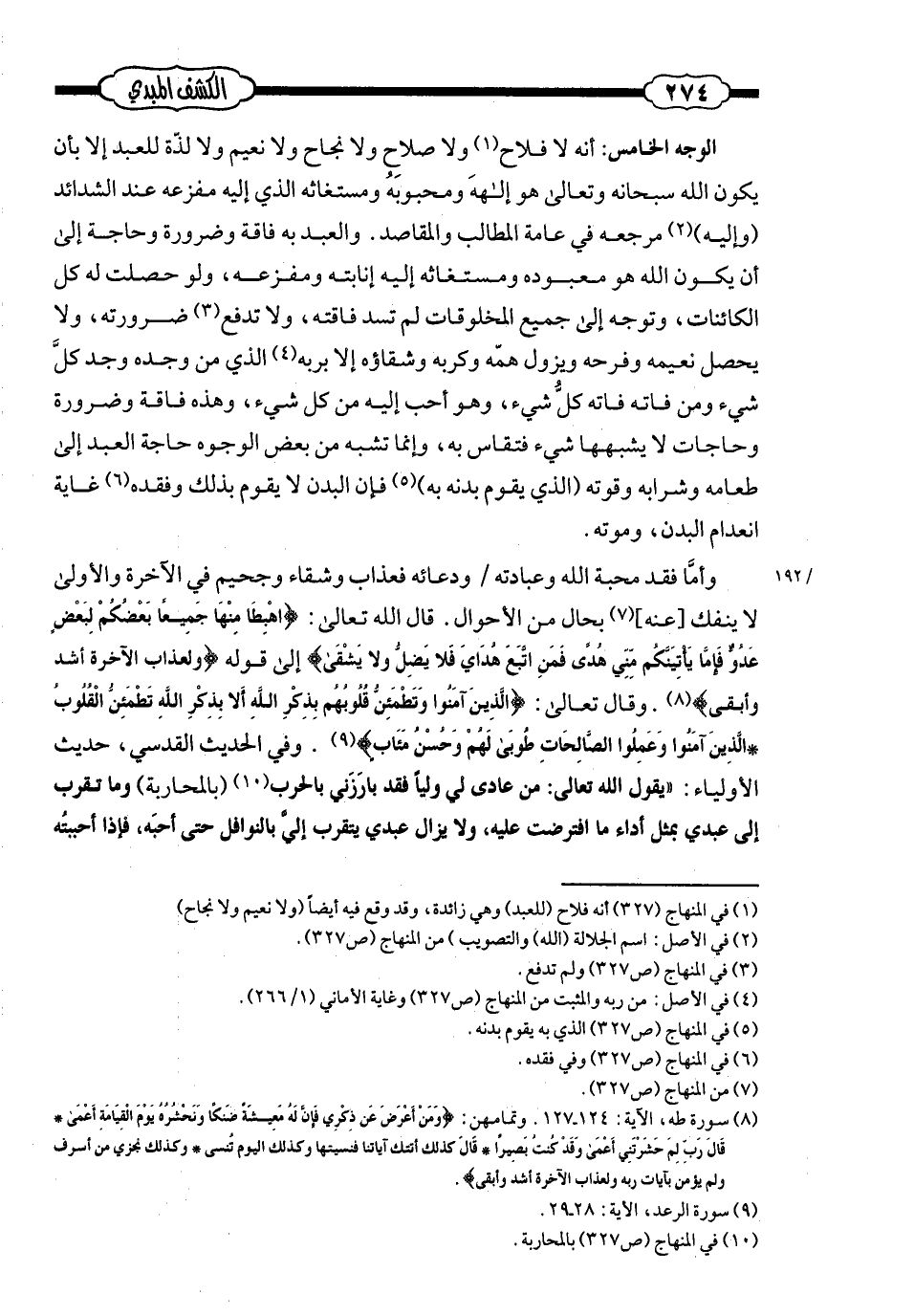 الوجه الخامس: أنّه لا فلاح ولا صلاح ولا نجاح ولا نعيم ولا لذّة للعبد إلَّا بأن يكون الله ـ سبحانه وتعالى ـ هو إلهه ومحبوبه ومستغاثه الذي إليه مفزعه عند الشّدائد، وإليه مرجعه في عامّة المطالب والمقاصد. والعبد به فاقة وضرورة وحاجة إلى أن يكون الله هو معبوده ومستغاثه، وإليه إنابته ومفزعه، ولو حصلت له كلّ الكائنات وتوجّه إلى جميع المخلوقات؛ لم تسدّ فاقته، ولا تدفع ضرورته، ولا يحصل نعيمه وفرحه ويزول همّة كربه وشقاؤه إلَّا بربّه؛ الذي مَن وجده وجد كلّ شيء، ومَن فاته فاته كلّ شيء، وهو أحبّ إليه من كلّ شيء، وهذه فاقة وضرورة وحاجات لا يشبهها شيء فتقاس به؛ وإنّما تشبه من بعض الوجوه حاجة العبد إلى طعامه وشرابه وقوّته الذي يقوم بدنه به؛ فإنّ البدن لا يقوم [إلَّا] بذلك، وفقده غاية انعدام البدن وموته. وأمّا فقد محبّة الله وعبادته ودعائه؛ فعذاب وشقاء وجحيم في الآخرة والأولى، لا ينفكّ [عنه] بحال من الأحوال. قال الله ـ تعالى ـ: {اهبطا منها جميعًا بعضكم لبعض عدوّ فإمّا يأتينّكم منّي هدى فمَن تبع هداي فلا يضلّ ولا يشقى} إلى قوله: {ولعذاب الآخرة أشدّ وأبقى} ، وقال ـ تعالى ـ: {الذين آمنوا وتطمئنّ قلوبهم بذكر الله ألا بذكر الله تطمئنّ القلوب * الذين آمنوا وعملوا الصّالحات طوبى لهم وحسن مئاب} ، وفي الحديث القدسيّ ـ حديث الأولياء ـ؛ يقول الله ـ تعالى ـ: «مَن عادى لي وليًّا فقد بارزني بالحرب، وما تقرّب إليّ عبدي بمثل أداء ما افترضتُ عليه، ولا يزال عبدي يتقرّب إليّ بالنّوافل حتّى أحبّه، فإذا أحببتُه