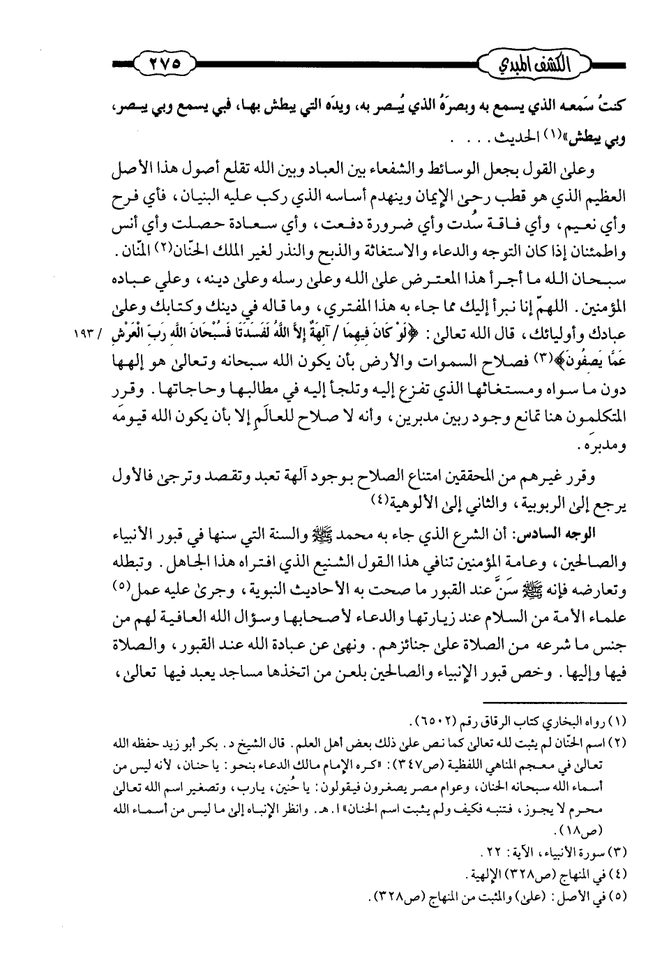 وعلى القول بجعل الوسائط والشّفعاء بين العباد وبين الله؛ تقلع أصول هذا الأصل العظيم؛ الذي هو قطب رحى الإيمان، وينهدم أساسه الذي ركّب عليه البنيان؛ فأيّ فرح، وأيّ نعيم، وأيّ فاقة سُدّت، وأيّ ضرورة دُفعت، وأيّ سعادة حصلت، وأيّ أنس واطمئنان إذا كان التّوجّه والدُّعاء والاستغاثة والذّبح والنّذر لغير الله الحنّان المنّان؟! سبحان الله! ما أجرأ هذا المعترض على الله وعلى رسله وعلى دينه وعلى عباده المؤمنين! اللهمّ إنّا نبرأ إليك مما جاء به هذا المفتري، وما قاله في دينك وكتابك وعلى عبادك وأوليائك. قال الله ـ تعالى ـ: {لو كان فيهما آلهة إلَّا الله لفسدتا فسبحان الله ربّ العرش عمّا يصفون} ؛ فصلاح السّماوات والأرض بأن يكون الله ـ سبحانه وتعالى ـ هو إلهها دون ما سواه، ومستغاثها الذي تفزع إليه وتلجأ إليه في مطالبها وحاجاتها، وقرّر المتكلّمون ـ هنا ـ: تمانع وجود ربّين مدبّرين؛ وأنّه لا صلاح للعالَم إلَّا بأن يكون الله قيومه ومدبّره، وقرّر غيرهم من المحقّقين: امتناع الصّلاح بوجود آلهة تُعبد وتُقصد وتُرجى. فالأوّل يرجع إلى الرّبوبيّة، والثّاني إلى الألوهيّة.