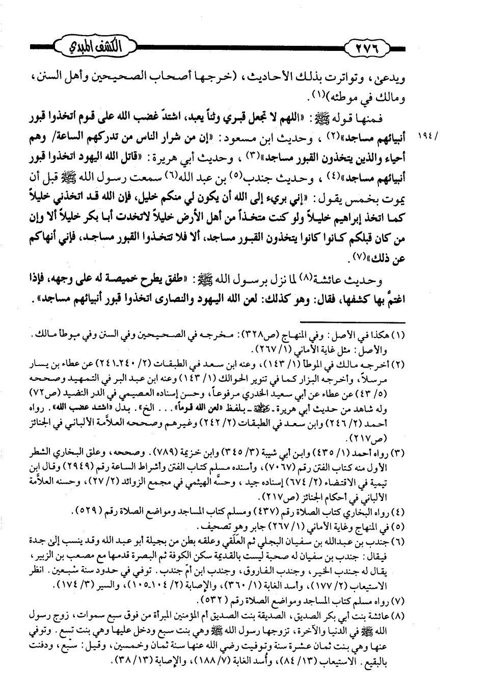 فمنها: قوله صلى الله عليه وسلم: «اللهمّ لا تجعل قبري وثنًا يُعبد، اشتدّ غضب الله على قوم اتّخذوا قبور أنبيائهم مساجد» ، وحديث ابن مسعود: «إنّ من شرار النّاس مَن تدركهم السّاعة وهم أحياء، والذين يتّخذون القبور مساجد» ، وحديث أبي هريرة: «قاتل الله اليهود؛ اتّخذوا قبور أنبيائهم مساجد» ، وحديث جندب بن عبد الله، سمعتُ رسول الله صلى الله عليه وسلم قبل أن يموت بخمس يقول: «إنّي بريء إلى الله أن يكون لي منكم خليل؛ فإنّ الله قد اتّخذني خليلًا كما اتّخذ إبراهيم خليلًا، ولو كنتُ متّخذًا من أهل الأرض خليلًا؛ لاتخذتُ أبا بكر خليلًا، ألا وإنّ مَن كان قبلكم كانوا يتّخذون القبور مساجد؛ ألا فلا تتّخذوا القبور مساجد؛ فإنّي أنهاكم عن ذلك» ، وحديث عائشة: لما نزل برسول الله صلى الله عليه وسلم طفق يطرح خميصة له على وجهه، فإذا اعتمّ بها كشفها؛ فقال ـ وهو كذلك ـ: «لعن الله اليهود والنّصارى؛ اتّخذوا قبور أنبيائهم مساجد» .
