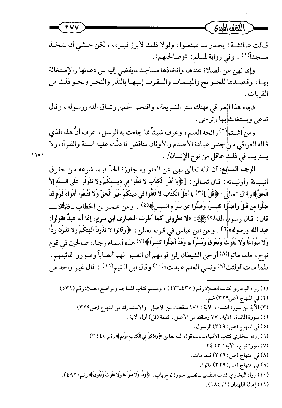 الوجه السّابع: أنّ الله ـ تعالى ـ نهى عن الغلوّ ومجاوزة الحدّ فيما شرعه من حقوق أنبيائه وأوليائه؛ قال ـ تعالى ـ: [ {يا أهل الكتاب لا تغلو في دينكم ولا تقولوا على الله إلَّا الحقّ} ، وقال تعالى: {قل] يا أهل الكتاب لا تغلو في دينكم غير الحقّ ولا تتبعوا أهواء قوم قد ضلّوا من قبل وأضلّوا كثيرًا وضلّوا عن سواء السّبيل} ، وعن عمر بن الخطّاب ـ رضي الله عنه ـ قال: قال رسول الله صلى الله عليه وسلم: «لا تطروني كما أطرت النّصارى ابن مريم؛ إنّما أنا عبد؛ فقولوا: عبد الله ورسوله» ، وعن ابن عبّاس في قوله ـ تعالى ـ: {وقالوا لا تذرنّ آلهتكم ولا تذرنّ ودًّا ولا سُواعًا ولا يغوث ويعوق ونسرًا * وقد أضلّوا كثيرًا} : «هذه أسماء رجال صالحين في قوم نوح، فلمّا ماتوا؛ أوحى الشّيطان إلى قومهم: أن انصبوا لهم أنصابًا وصوّروا تماثيلهم، فلمّا مات أولئك ونُسي العلم؛ عُبدت» . وقال ابن القيّم: «قال غير واحد من