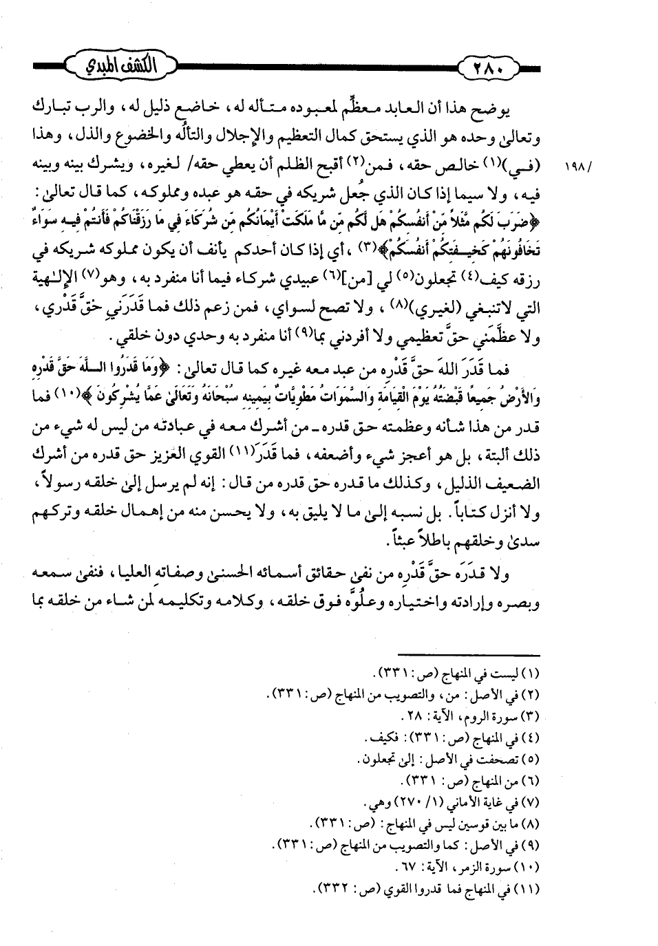فما قدر الله حقّ قدره مَن عبد معه غيره؛ كما قال ـ تعالى ـ: {وما قدروا الله حقّ قدره والأرض جميعًا قبضته يوم القيامة والسّموات مطويّات بيمينه سبحانه وتعالى عمّا يشركون} ؛ فما قدر مَن هذا شأنه وعظمته حقّ قدره مَن أشرك معه في عبادته مَن ليس له شيء من ذلك ألبتة؛ بل هو أعجز شيء وأضعفه؛ فما قدر القويّ العزيز حقّ قدره مَن أشرك الضّعيف الذّليل، وكذلك ما قدره حقّ قدره مَن قال: إنّه لم يرسل إلى خلقه رسولًا ولا أنزل كتابًا؛ بل نسبه إلى ما لا يليق به ولا يحسن منه؛ من إهمال خلقه وتركهم سدى وخلقهم باطلًا عبثًا، ولا قدره حقّ قدره مَن نفى حقائق أسمائه الحسنى وصفاته العليا؛ فنفى سمعه وبصره وإرادته واختياره، وعلوّه فوق خلقه، وكلامه وتكليمه لمَن شاء من خلقه بما