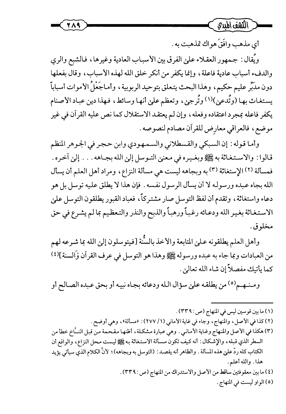 وأمّا قوله: «إنّ السّبكيّ والقسطلانيّ والسّمهوديّ وابن حجر في «الجوهر المنظم» قالوا: والاستغاثة به صلى الله عليه وسلم وبغيره في معنى التّوسّل إلى الله بجاهه ... » إلى آخره؛ فمسألة الاستغاثة به وبجاهه ليست هي مسألة النّزاع، ومراد أهل العلم: أن يسأل الله بجاه عبده ورسوله، لا أن يسأل الرّسول نفسه؛ فإنّ هذا لا يطلق عليه (توسّل) ؛ بل هو دعاء واستغاثة؛ وتقدّم أنّ لفظ (التّوسّل) صار مشتركًا؛ فعبّاد القبور يطلقون (التّوسّل) على: الاستغاثة بغير الله ودعائه رغبًا ورهبًا، والذّبح والنّر والتّعظيم بما لم يشرع في حقّ مخلوق، وأهل العلم يطلقونه على: المتابعة والأخذ بالسُّنّة؛ [فيتوسّلون إلى الله بما شرعه لهم من العبادات، وبما جاء به عبده ورسوله صلى الله عليه وسلم، وهذا هو التّوسّل في عُرف القرآن والسُّنّة]ـ كما يأتيك مفصّلًا (إن شاء الله تعالى) ـ.