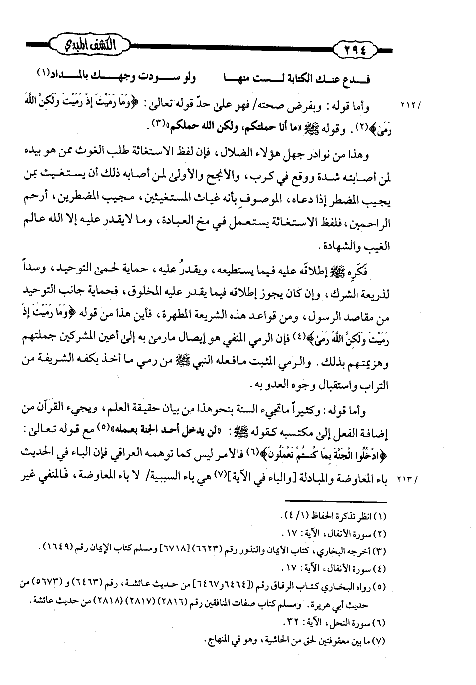 وأمّا قوله: «وبفرض صحّته؛ فهو على حدّ قوله ـ تعالى ـ: {وما رميتَ إذ رميتَ ولكنّ الله رمى} ، وقوله صلى الله عليه وسلم: «ما أنا حملتُكم؛ ولكنّ الله حملكم» » ؛ وهذا من نوادر جهل هؤلاء الضّلّال؛ فإنّ لفظ (الاستغاثة) : طلب الغوث ممّن هو بيده لمن أصابته شدّة ووقع في كرب، والأنجح والأولى لمن أصابه ذلك أن يستغيث بمَن يجيب المضطرّ إذا دعاه، الموصوف بأنّه غياث المستغيثين، مجيب المضطرّين، أرحم الرّاحمين؛ فلفظ (الاستغاثة) يستعمل في مخّ العبادة، وما لا يقدر عليه إلَّا الله عالم الغيب والشّهادة. فكَرِه صلى الله عليه وسلم إطلاقَه عليه فيما يستطيعه ويقدر عليه؛ حماية لحمى التّوحيد، وسدًّا لذريعة الشّرك، وإن كان يجوز إطلاقه فيما يقدر عليه المخلوق؛ فحماية جانب التّوحيد من مقاصد الرّسول، ومن قواعد هذه الشّريعة المطهّرة؛ فأين هذا من قوله: {وما رميتَ إذ رميتَ ولكنّ الله رمى} ؛ فإنّ (الرّمي) المنفيّ: هو إيصال ما رمى به إلى أعين المشركين جملتهم وهزيمتهم بذلك، و (الرّمي) المثبت: ما فعله النّبيّ صلى الله عليه وسلم من رمي ما أخذ بكفّه الشّريفة من التّراب واستقبال وجوه العدوّ به.