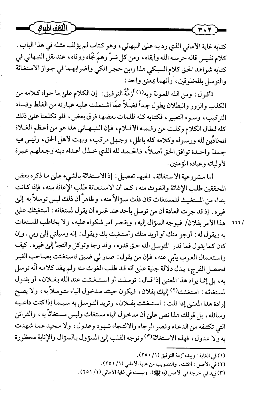 كتابه «غاية الأماني» الذي ردّ به على النّبهانيّ ـ وهو كتاب لم يؤلّف مثله في هذا الباب ـ كلام نفيس؛ قاله ـ حرسه الله وأبقاه، ومن كلّ شرّ وهمّ نجّاه ووقّاه ـ عند نقل النّبهانيّ في كتابه «شواهد الحقّ» كلام السّبكيّ هذا وابن حجر المكيّ وأضرابها في جواز الاستغاثة والتّوسّل بالمخلوقين، وأنّهما بمعنى واحد:
