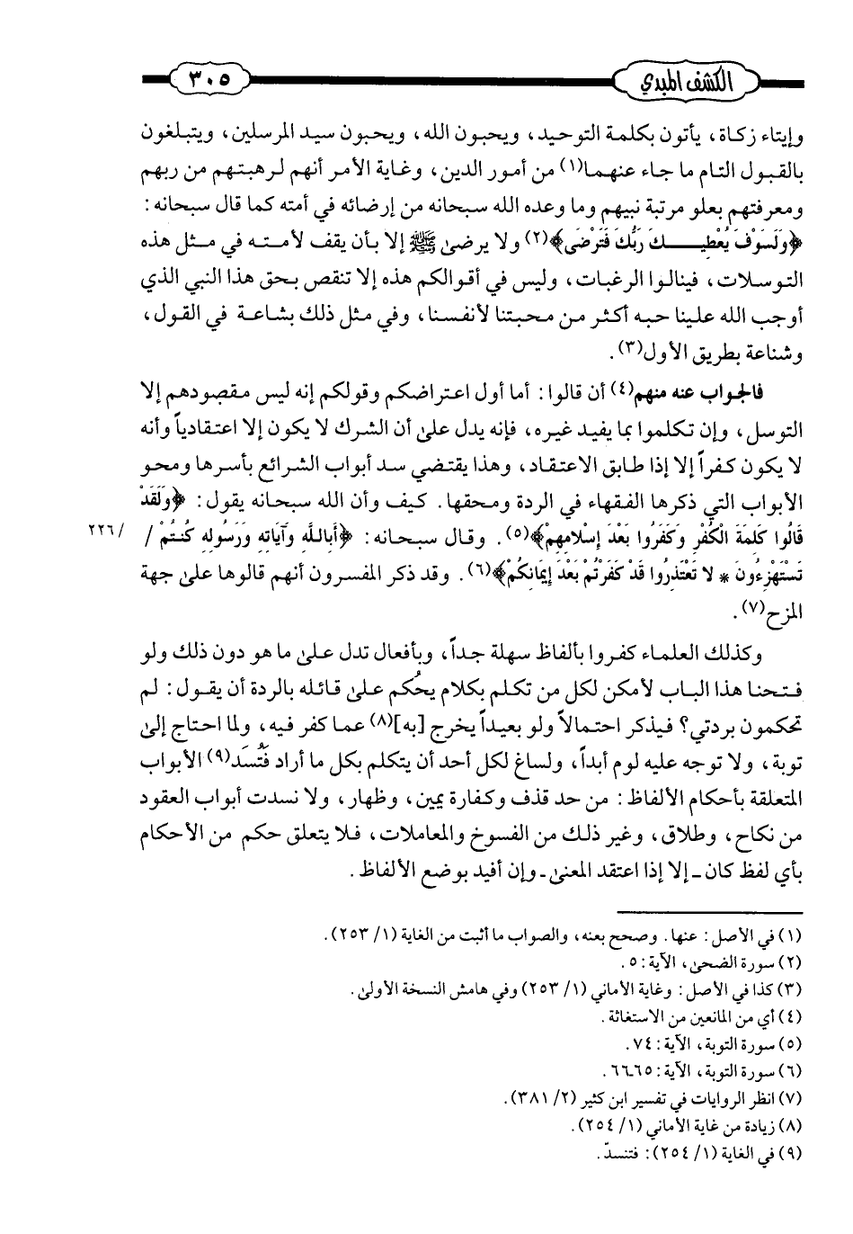 وكذلك العلماء كفّروا بألفاظ سهلة جدًّا، وبأفعال تدلّ على ما هو دون ذلك؟! ولو فتحنا هذا الباب؛ لأمكن لكلّ مَن تكلّم بكلام يُحكم على قائله بالرّدّة أن يقول: لِمَ تحكمون برِدّتي؟! فيذكر احتمالًا ـ ولو بعيدًا ـ يخرج [به] عمّا كفر فيه! ولما احتاج إلى توبة، ولا توجّه عليه لوم أبدًا! ولساغ لكلّ أحد أن يتكلّم بكلّ ما أراد؛ فتُسَدّ الأبواب المتعلّقة بأحكام الألفاظ ـ من: حدّ قذف، وكفارة يمين، وظهار ـ، ولانسدّت أبواب العقود ـ من: نكاح، وطلاق، وغير ذلك من الفسوخ والمعاملات ـ؛ فلا يتعلّق حكم من الأحكام بأيّ لفظ كان إلَّا إذا اعتقد المعنى، وإن أفيد بوضع الألفاظ!