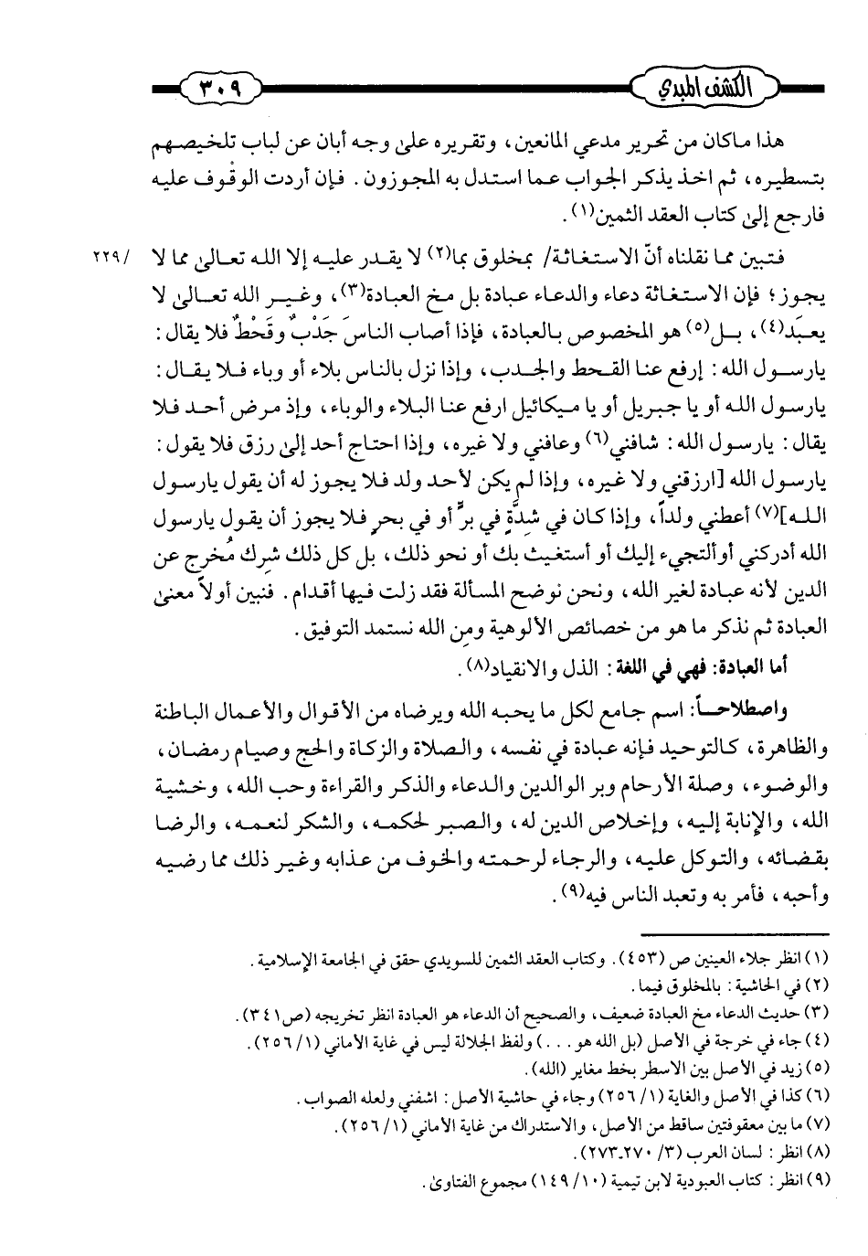 فتبيّن ممّا قلناه: أنّ الاستغاثة بمخلوق بما لا يقدر عليه إلَّا الله ـ تعالى ـ ممّا لا يجوز؛ فإنّ الاستغاثة دعاء، والدُّعاء عبادة، بل مخّ العبادة، وغير الله ـ تعالى ـ لا يُعبَد؛ بل هو المخصوص بالعبادة؛ فإذا أصاب النّاسَ جدبٌ وقحطٌ؛ فلا يُقال: يا رسول الله؛ ارفع عنّا القحط والجدب، وإذا نزل بالنّاس بلاء أو وباء؛ فلا يُقال: يار رسول الله، أو: يا جبريل، أو: يا ميكائيل؛ ارفع عنّا البلاء والوباء، وإذا مرض أحد؛ فلا يُقال: يا رسول الله؛ شافني وعافني، ولا غيره، وإذا احتاج أحد إلى زرق؛ فلا يقول: يا رسول الله؛ [ارزقني، ولا غيره، وإذا لم يكن لأحد ولد؛ فلا يجوز له أن يقول: يا رسول الله] ؛ أعطني ولدًا، وإذا كان في شدّة في برٍّ أو بحرٍ؛ فلا يجوز أن يقول: يا رسول الله؛ أدركني، أو: ألتجئ إليك، أو: أستغيث بك، أو نحو ذلك؛ بل كلّ ذلك شرك مخرج عن الدّين؛ لأنّه عبادة لغير الله.