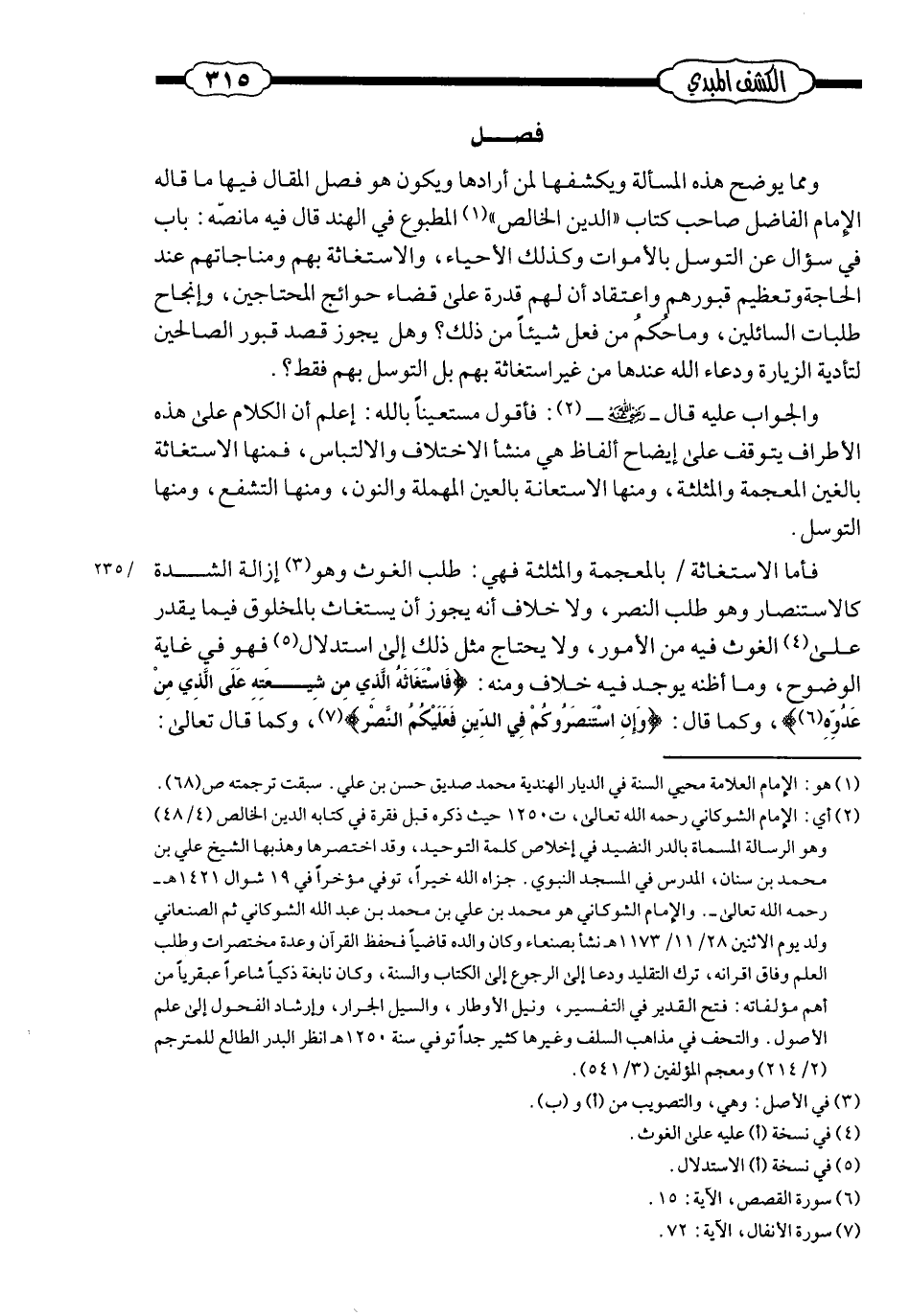 وممّا يوضّح هذه المسألة ويكشفها لمَن أرادها، ويكون هو فصل المقال فيها: ما قاله الإمام الفاضل صاحب كتاب «الدّين الخالص» ـ المطبوع في الهند ـ؛ قال فيه ما نصّه: